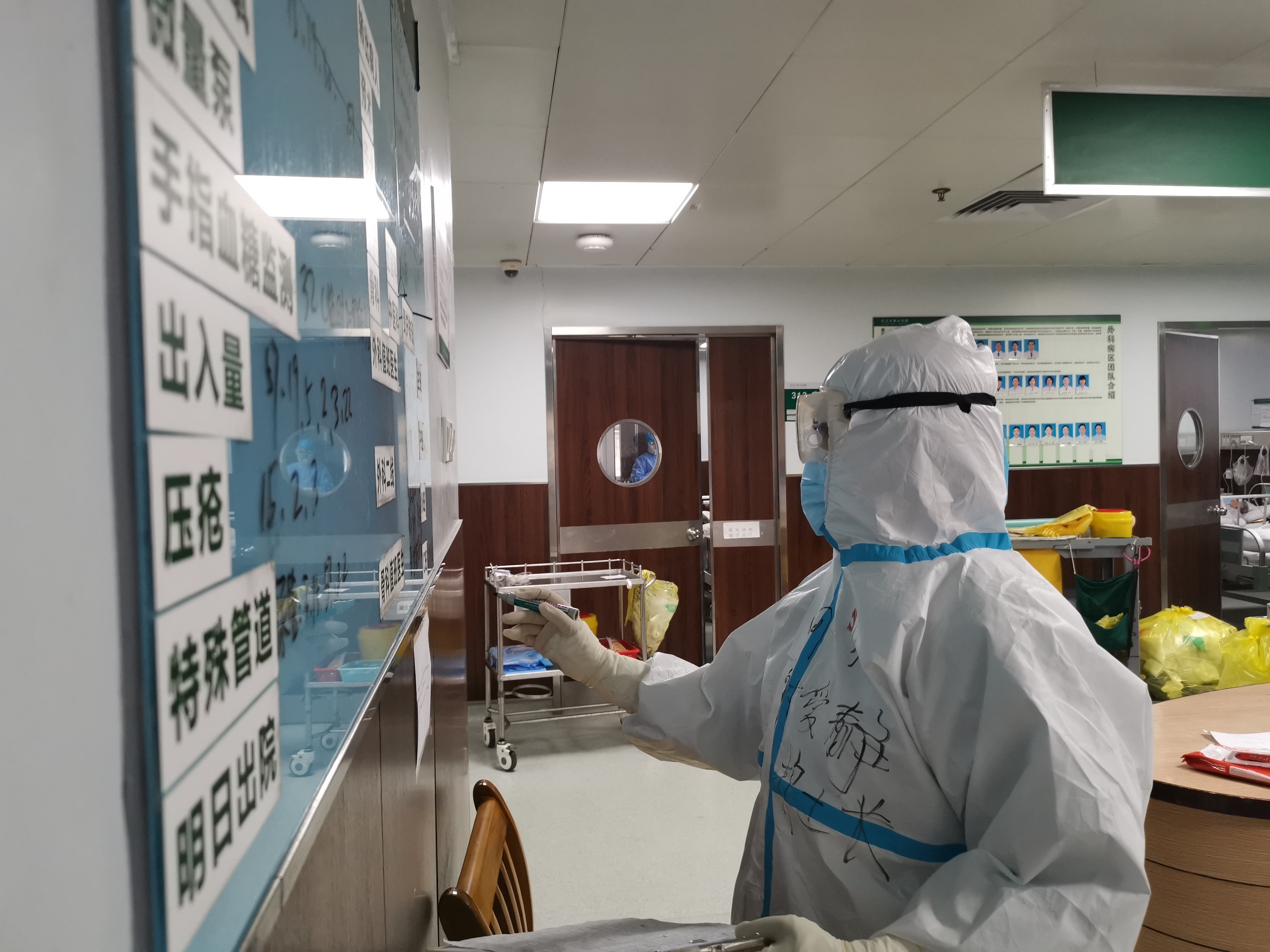由于业务能力和工作时的认真细心,我被选为河北省支援湖北医疗队普通病区二组护士长兼武汉七院第四病区临时护士长。自1月26日进驻四病区以来,每天早上5点起床,检查队员们的体温,领取并安排医用物资。带领大家做好晨间护理、整理病房,督促检查并帮助进入隔离病区的护理人员做好个人防护,做好交办,每名病人都床头交接班,然后开始一天的护理治疗工作,一直忙到晚上10点。四病区有48张床位,收治病危患者5、6名,重症患者30来名,多数病人年龄在60岁以上。我每天穿着防护服在病房里工作6、7个小时,每次接班后,都为患者测体温、抽血、测血氧饱和度、做核酸咽拭子采集等检测,并为患者更换被服,擦拭身体、清理大小便和呕吐物……护士长首先是一名护士,必须战斗在疫情第一线,这是我的职责所在,也是分内之事,我不怕辛苦,唯一的希望就是通过我们的努力,早点把这次疫情控制住,尽自己一份力量。
