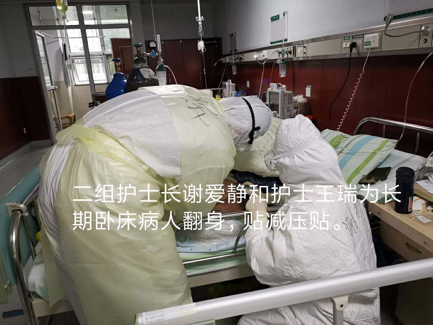 因为新冠肺炎患者需要隔离治疗,部分患者存在畏惧心理。我在护理工作中,注重疏导患者内心深处的恐惧和孤独,最开始因为方言而出现言语沟通障碍就请同病房的年纪轻的患者帮忙翻译,慢慢地能用不标准的武汉话,鼓励引导患者正确面对疾病、面对痛苦。我要求四病区所有护士利用休息时间,学习微信上总结梳理好的相关病例的护理规范,做好每名患者护理,在营养、心理、压疮护理等方面做成课件,带领大家一起学习,更好地做好患者饮食营养,心理疏导,肺功能锻炼,鼓励引导他们正确面对疾病,战胜病魔,放下思想包袱,对治疗充满自信、积极配合治疗,争取早日康复出院。