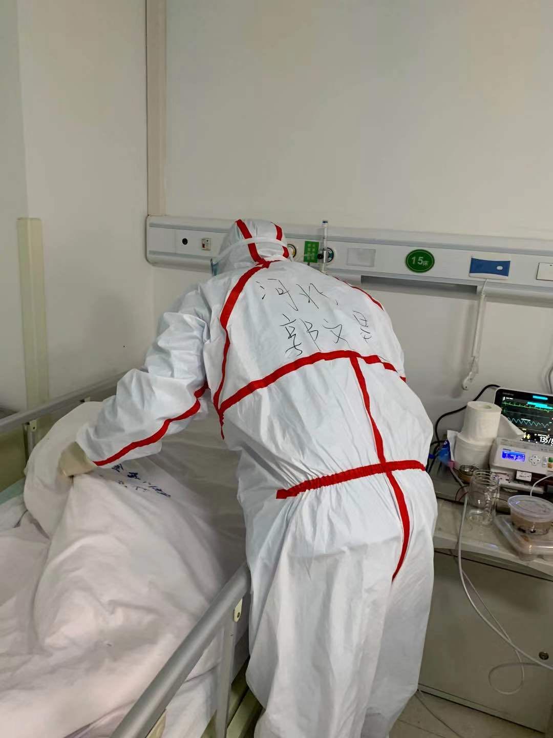 工作两三天后,开始适应这样的工作了,操作起来也顺利多了。因为处于疫情期间,病房里都是满员,病情危重的占大部分,除日常诊疗外,我们还承担起了患者的生活护理工作,每天帮助不能自理的患者喂饭、喂水、翻身、处理大小便等。