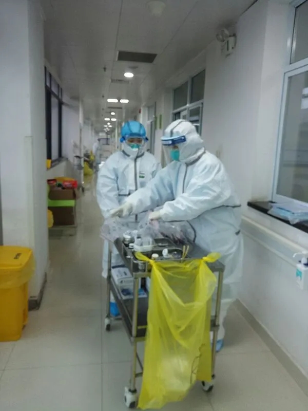 进入病房的第一天,我就真切体会到了身上这身装备有多不适,但这种不适也正是我们安全感的来源,是保护我们的盔甲。病房里床位爆满,病人病情危重,呼叫铃此起彼伏,我们根本没有时间考虑其他的,一门心思就是为病人做好治疗护理,一进入病房我们就迅速转换角色,熟悉了病房环境和物品放置位置后就忙碌起来。输液、采血、采集咽拭子等等都和我们平时的工作内容相似,唯一不同的是我们穿着厚厚的防护服,行动、视觉、听觉、触觉都不如平时灵敏,就连转头这个简单的动作都很难,说话要很大声才听得清,以前只需要一两分钟的血管穿刺现在至少需要5分钟,再加上年纪大一点的病人不会讲普通话,只讲方言,语言沟通存在障碍,工作一开始确实遇到了不少困难。