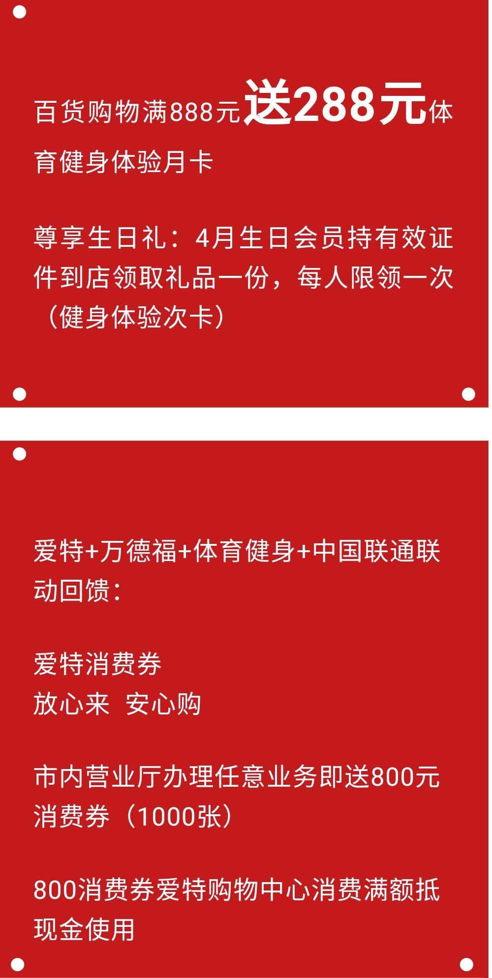 三、爱特+万德福+体育健身+中国联通联动回馈。室内营业厅办理任意业务即送800元消费券(消费券爱特购物中心消费满额抵现金使用)。