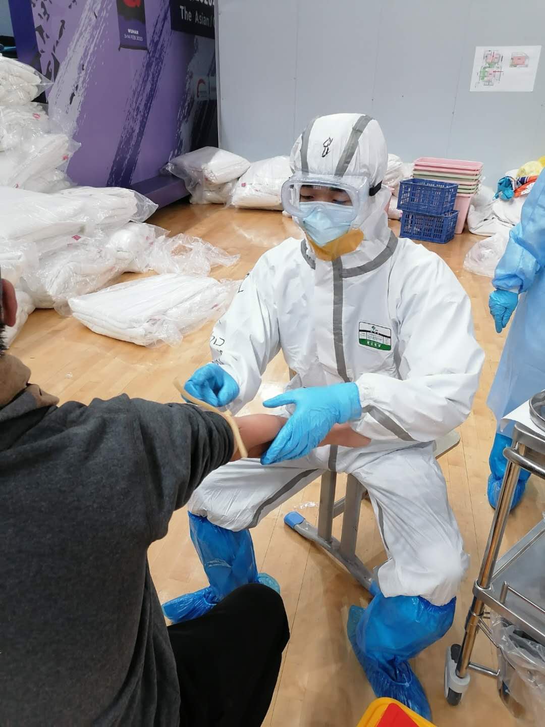 当自己穿上层层严密的防护装备,俨然是一个“可爱的大白”。可是,穿上防护服和尿不湿的种种不适,也只有真实感受过才能体会:缺氧,头晕,恶心,还有工作时间长,错开就餐时间引起的低血糖……甚至有呕吐,那种不可言语的吐出来,再咽下去……而这些,都是我在方舱医院工作中的亲身经历,甚至经历过嘴里含着呕吐物紧急出舱……而这些,并没有让我害怕和退缩。想办法,克服一切困难,缺氧就到通风处让冷风吹会儿,低血糖我就使劲儿吃!尤其是上班前,再加一顿!