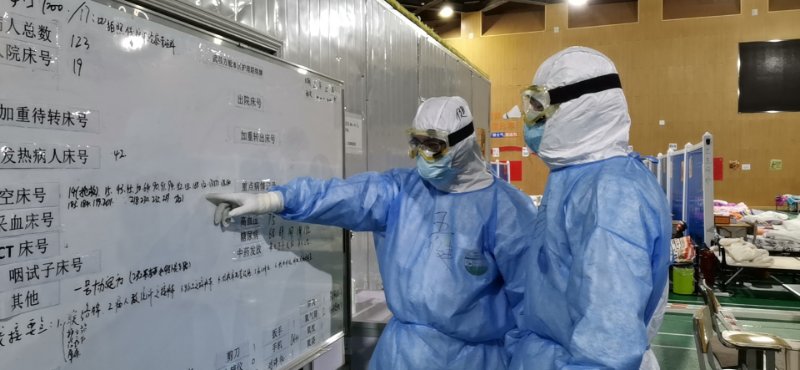 根据患者收治需要,河北队于11日晚间又抽调队员,承担了B舱的任务。而我们三个人有幸成为首批进入B区开展救治任务的工作人员,直到13日早8时,河北队全体队员从A舱撤出转战到B舱开始独立承担B舱护理任务,舱内患者多达281人,平均每位护理人员负责50余名新冠患者。