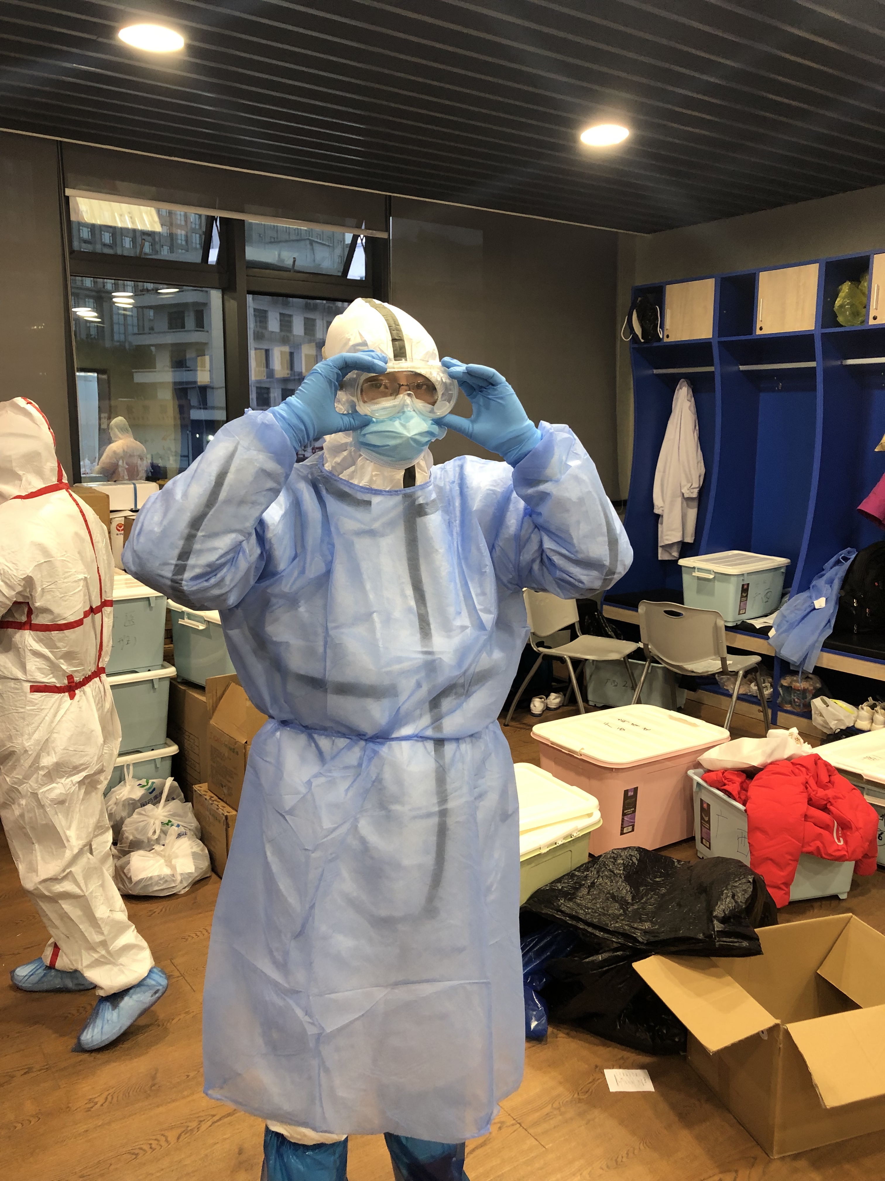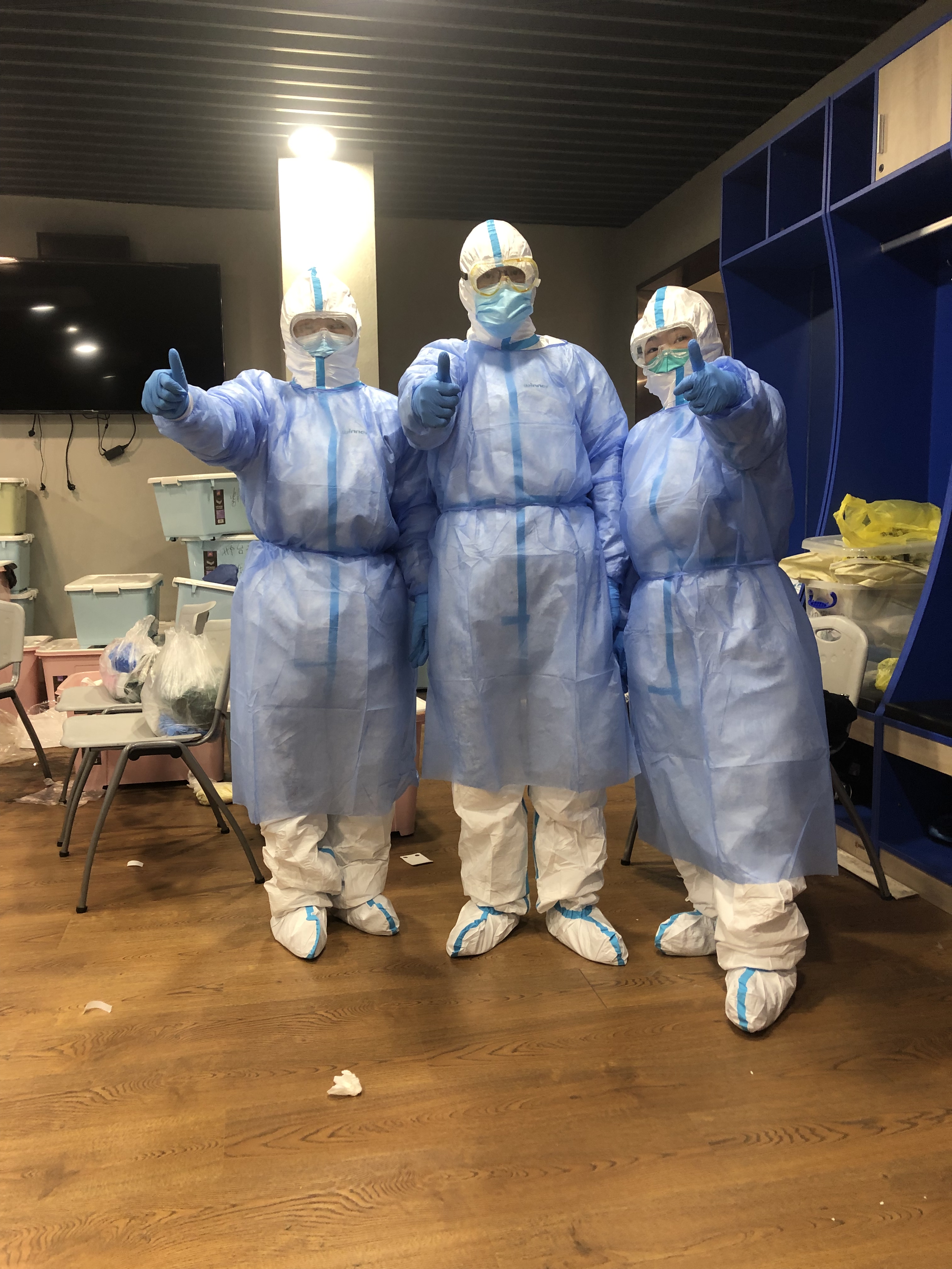 到达指定地点领取物资,去清洁区戴帽子、戴口罩、穿隔离衣、戴手套、鞋套、防护服、护目镜。一层层繁琐而救命的步骤,我们有条不紊的进行着。每个人都严谨的按照操作规程做好防护,被层层紧裹的队员彼此都认不出对方,大家就在防护服上作标记。