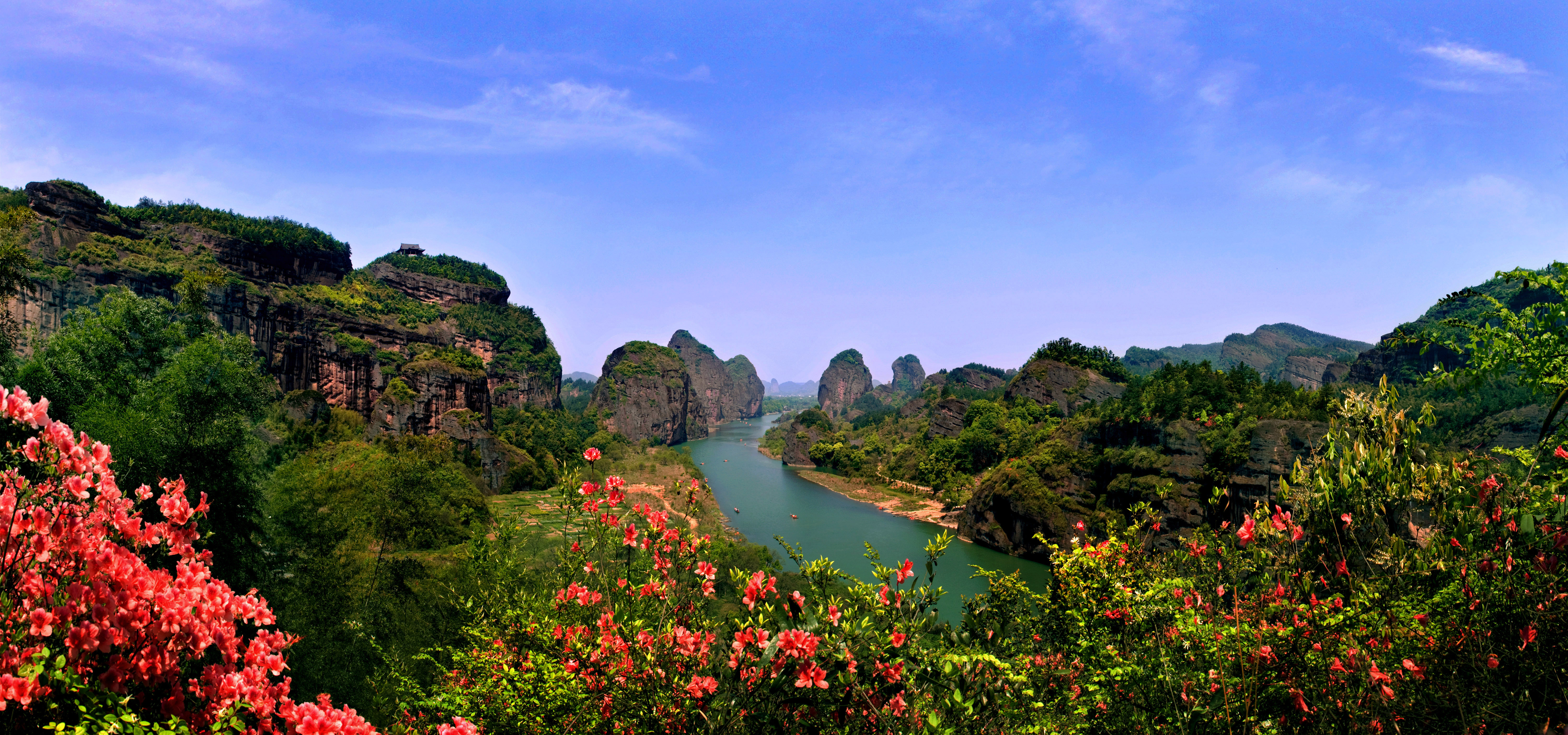 四月春光正好,龙虎山景区一丛一丛的鲜花开得灿烂,在青山掩映间,如火如荼。