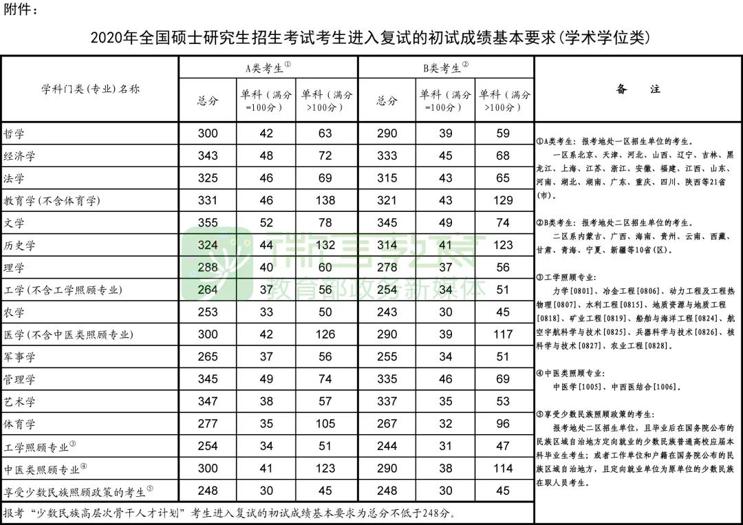 教育部公布2020年全国硕士研究生招生考试国家分数线