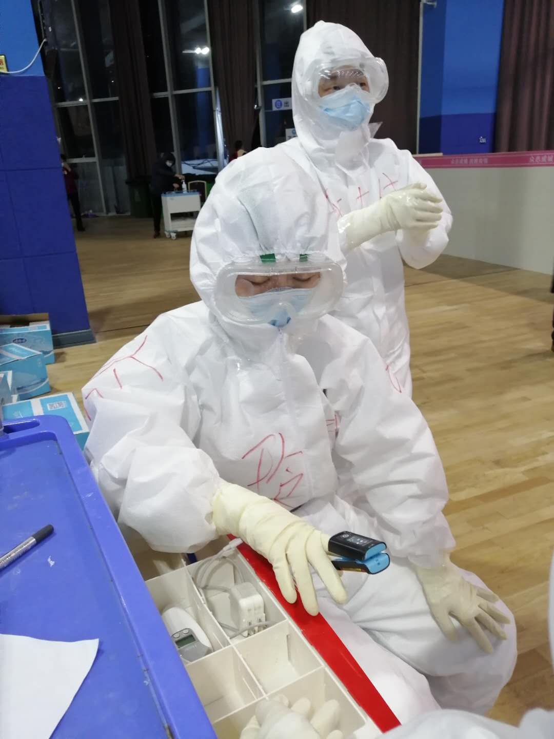 不进舱的时候,我们轮流负责支援湖北医疗队全体队员的后勤保障工作。环境的整理、出舱队员的消杀以及我们所住宾馆楼道的消杀等等工作。闲暇之余我们还会一起视频锻炼,在屋里做一些有氧运动,增强自己的免疫力,保障自己的强健体魄,只有这样我们才能更好的服务患者。