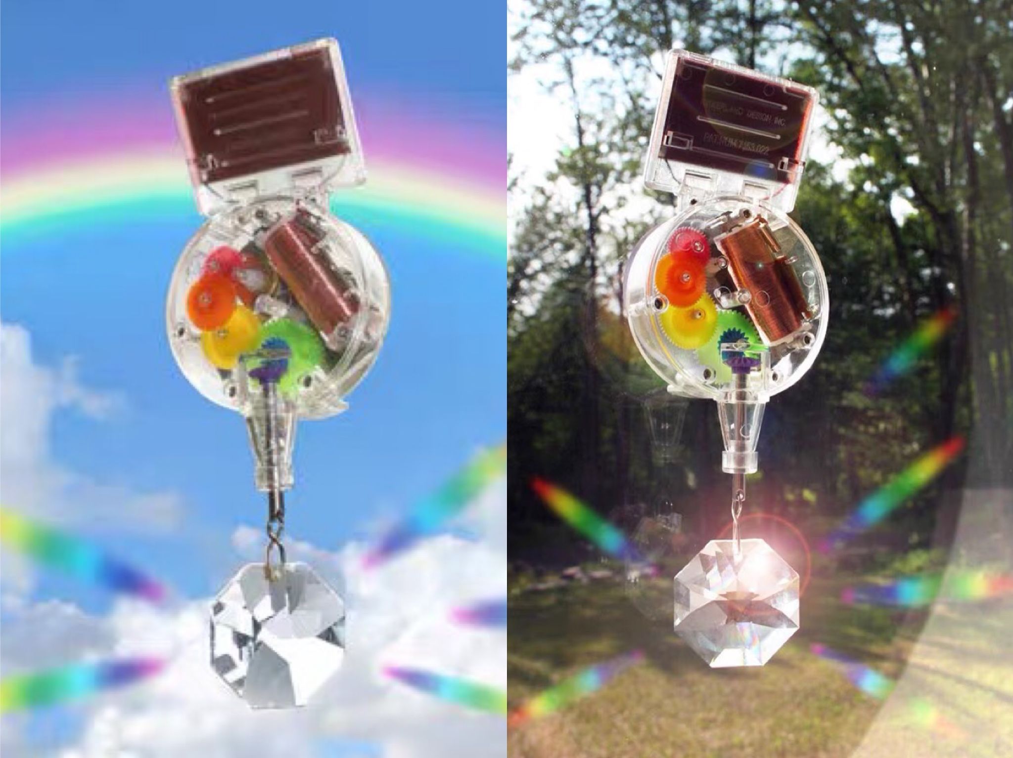 只要让这个彩虹制造机晒晒太阳,就可以给马达提供动力,使水晶旋转,当阳光透过水晶,便可以折射出美丽的彩虹般光影。当浪漫的彩虹出现在家中,心情也立刻明朗起来。