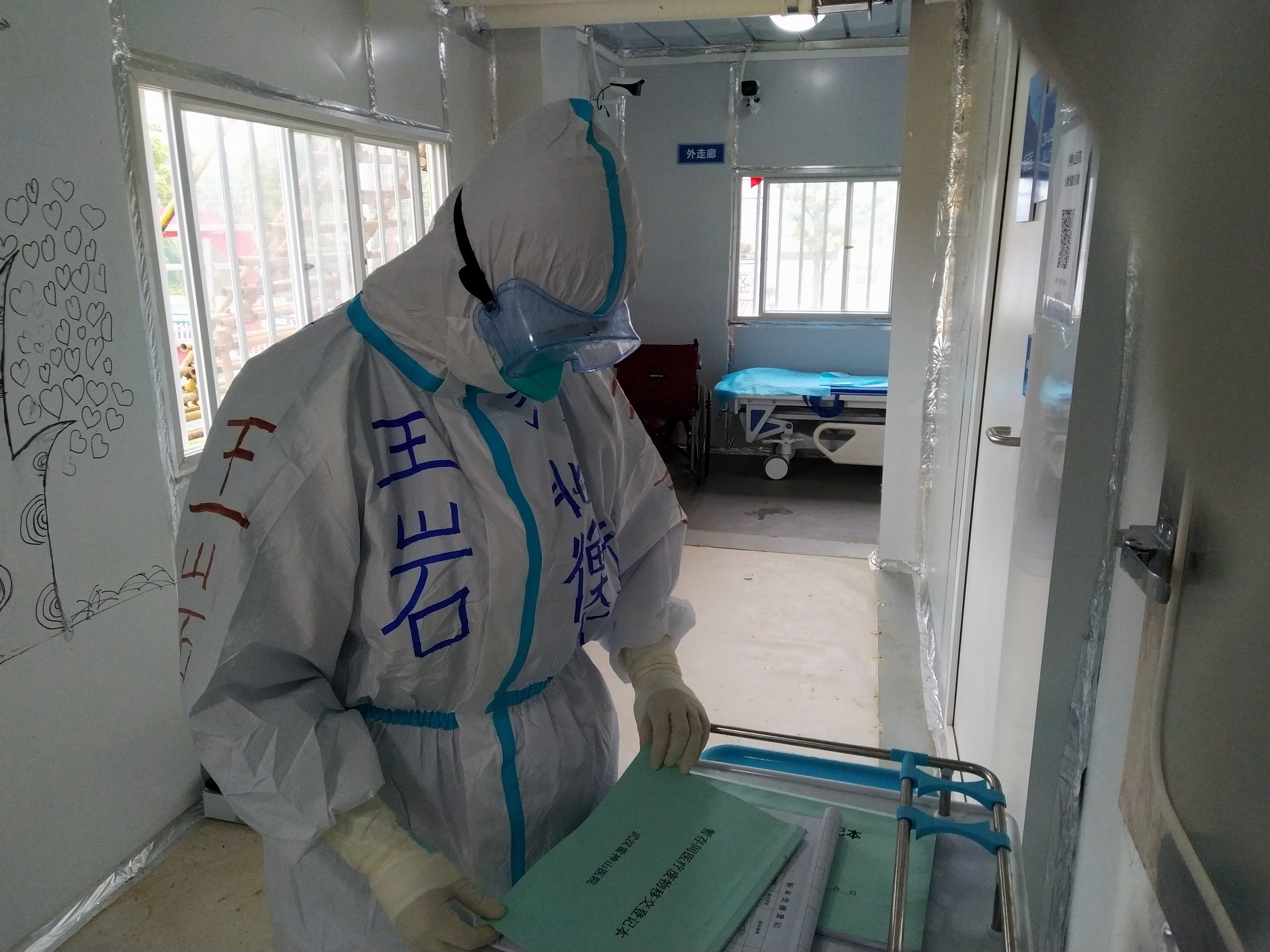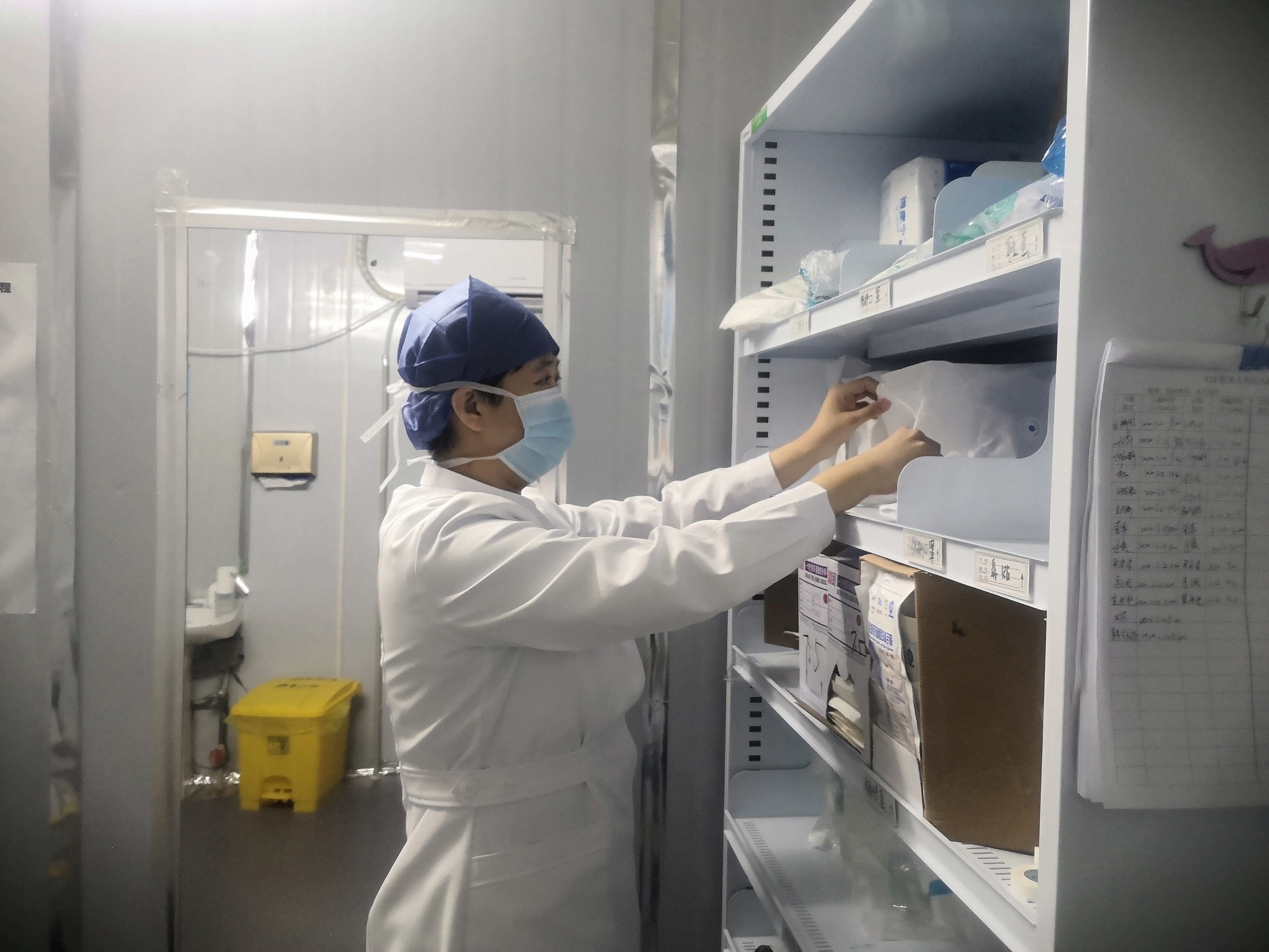 在隔离区,我认真查看各病室内卫生情况,紫外线消毒情况,负压是否在正常范围,各个缓冲间是否备有洗手用品,消毒液浓度是否达标,墩布是否悬挂等,及时对欠缺的物品进行调配补充。查看医护人员是否按照要求进行手卫生,尤其是“两前三后”(接触病人前、无菌清洁操作前、接触血液体液后、接触病人后、接触病人周围环境后)是否洗手或手消毒,查看床单位终末处理情况,使用的仪器、平车、轮椅等物品是否消毒,消毒湿巾、消毒剂是否注明开启日期等。检查污物间卫生情况,医疗垃圾运送登记情况。查看病区随手关门情况,患者衣物盛放情况,对检查中发现的问题如男、女更衣室杂乱,防护物品未按规定放置,穿脱防护用品流程不规范等进行了整改,确保了医护人员安全,物面光滑洁净,保洁干净卫生,院感管理井然有序,得到了雷神山医院院感督导组龚斐主任和医疗队院感负责人龚素霞主任的认可。