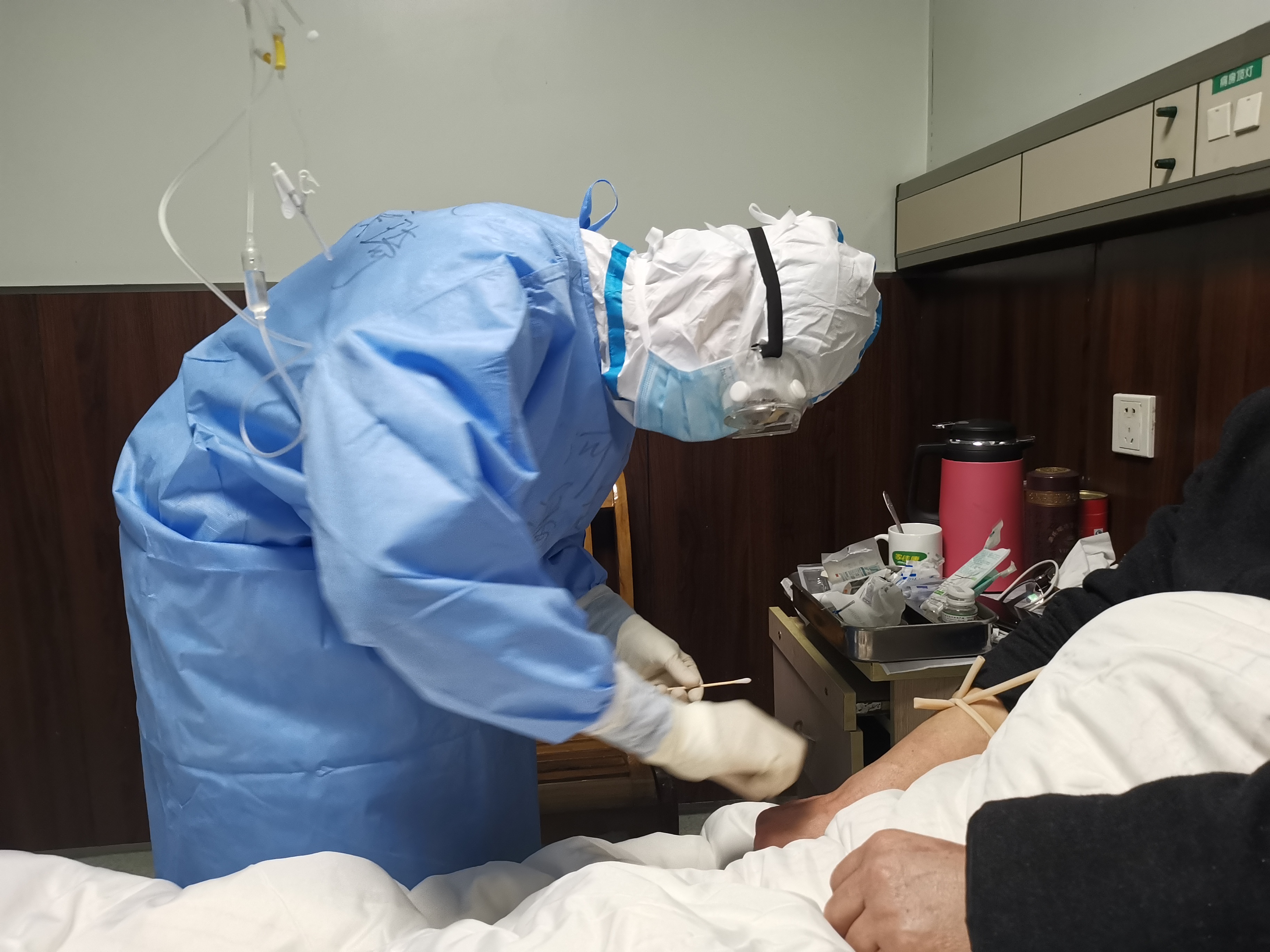 在雷神山我们男生主动承担了夜班任务,记得第一次上夜班时,34床的大爷情绪激动不配合治疗。询问原因,原来是因为对治疗方案不理解,老大爷是从中南医院转过来的,在中南医院时病情较重,所以给予了营养液输入,补充了白蛋白。现在病情好转,我与医生沟通后,了解到大爷现在无需补充营养了,我向老大爷耐心解释,老大爷听说病情好转很高兴,积极配合了工作。雷神山的病人大多都是乐观、积极向上的,但难免会遇到伤心事,在一次上夜班八点多去做治疗时,进病房后发现房间里漆黑一片,非常安静,我们打开灯才发现20床的阿姨在抹眼泪,一开始还以为阿姨担心病情或者是想念家人,后来邻床的老婆婆告诉我们她的家人没了,也就在这时阿姨哭出了声,说她的哥哥走了。看着阿姨这么伤心,我的眼泪也在眼睛里打转,想想阿姨深受疾病折磨,远离家人,现在至亲又离她而去,悲从中来,我必须为她做点什么。后来我坐在床边,倾听她的哭诉,安抚她的情绪,给阿姨加油打气,慢慢的阿姨心情平静下来,我才离开病房,阿姨反复感谢着我,我说:”这是我应该做的,我们不是亲人胜似亲人!“