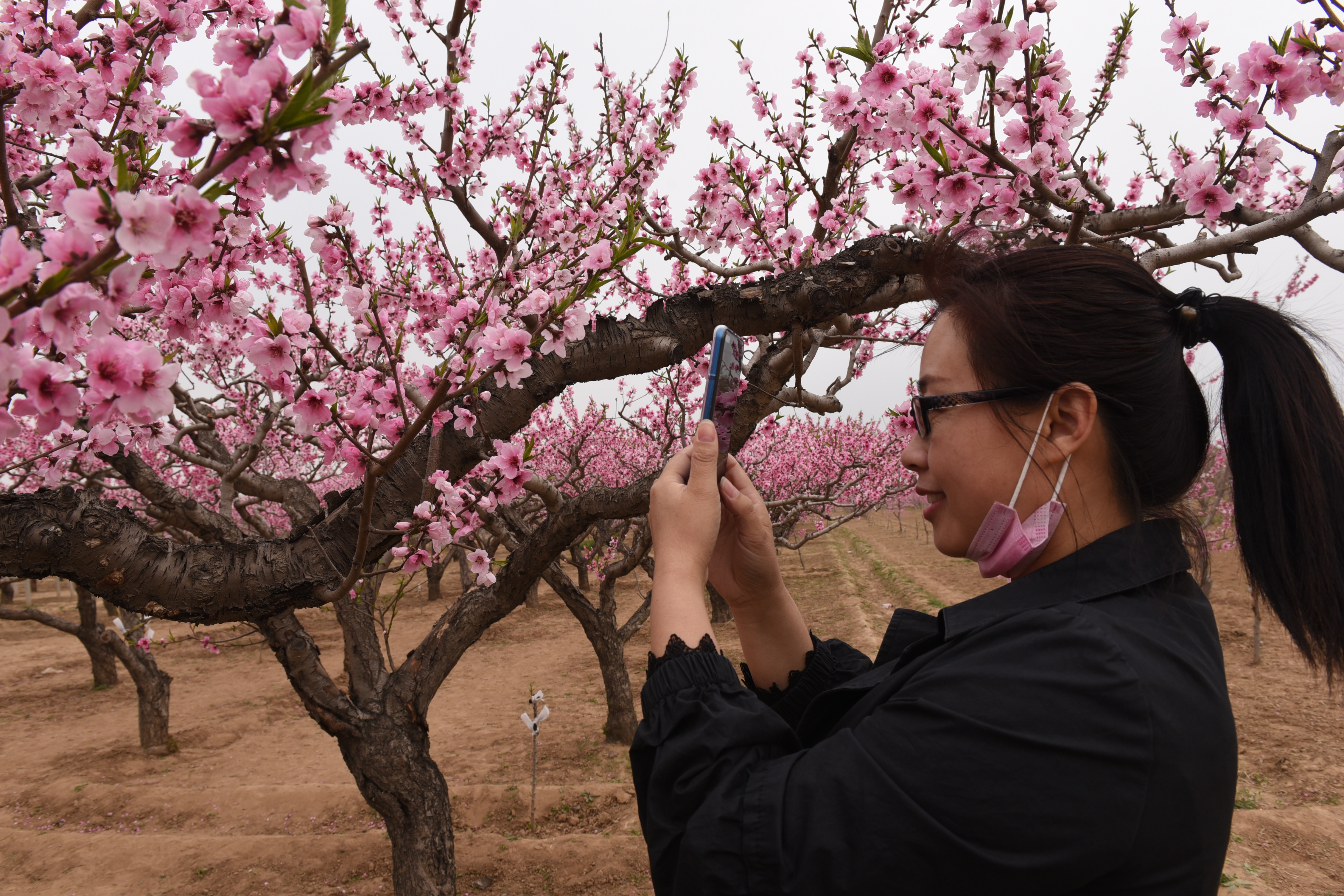 桃花灼灼斗春芳,一见如云满目光。与往年相同的是,游客们走进蜜桃观光园,徜徉于万亩生态桃林,登上观花台远眺花海,欣赏中华寿桃、人面桃花、桃园廉乡等特色景点,赏花、游戏、小憩、留影,如游仙境,心旷神怡,陶醉其中;与往年不同的是,大家都带着口罩,三三两两地,互相保持着一定的距离。深州全域旅游的兴起,游客对当地果农的思想观念带来了新冲击,促进了新转变。穆村乡马庄村桃农张老汉的果园紧临观光台。站在观花台上可俯看果园,赏桃花远景;走下观花台进入园中,可近距离观赏桃花。他专门在果园内修建了甬路,方便游客观花,还印制了名片,一边介绍深州蜜桃,一边分发给名片。“生态旅游提升了深州蜜桃的知名度,让俺们的日子越过越好。”他说:“春天来观花的游客,秋天往往又会来买桃。”像他这样的果农还有很多,有利用“互联网+”把深州蜜桃销往全国各地的老桃农张登高、有发展大棚桃种植实现错季销售的年轻创业者孟浩、有利用废弃桃木制作工艺品的“弄潮儿”李宗权、还涌现出一批利用自家庭院发展“农家乐”、烹制农家饭的典型人物。当地人感叹地说,如诗如画的桃花帮他们驶入了致富快车道。