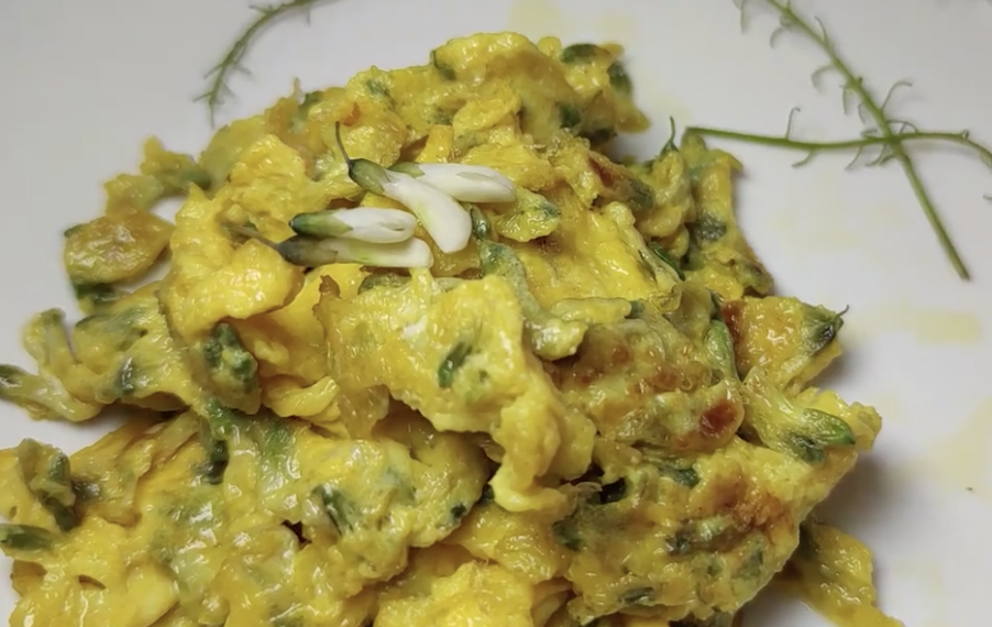 槐花炒鸡蛋是北方地区很普遍的一道家常菜。做法比较简单,将新鲜的槐花焯水和鸡蛋一起炒。槐花鸡蛋吃起来有一股淡淡的槐花香味,也有人将它和香椿炒鸡蛋并列为“春天最香的炒鸡蛋”。