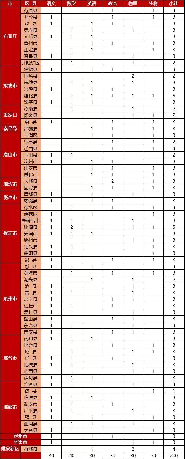 培养中学教师200名,分别是语文40名、数学40名、英语30名、政治30名、物理30名、生物30名。