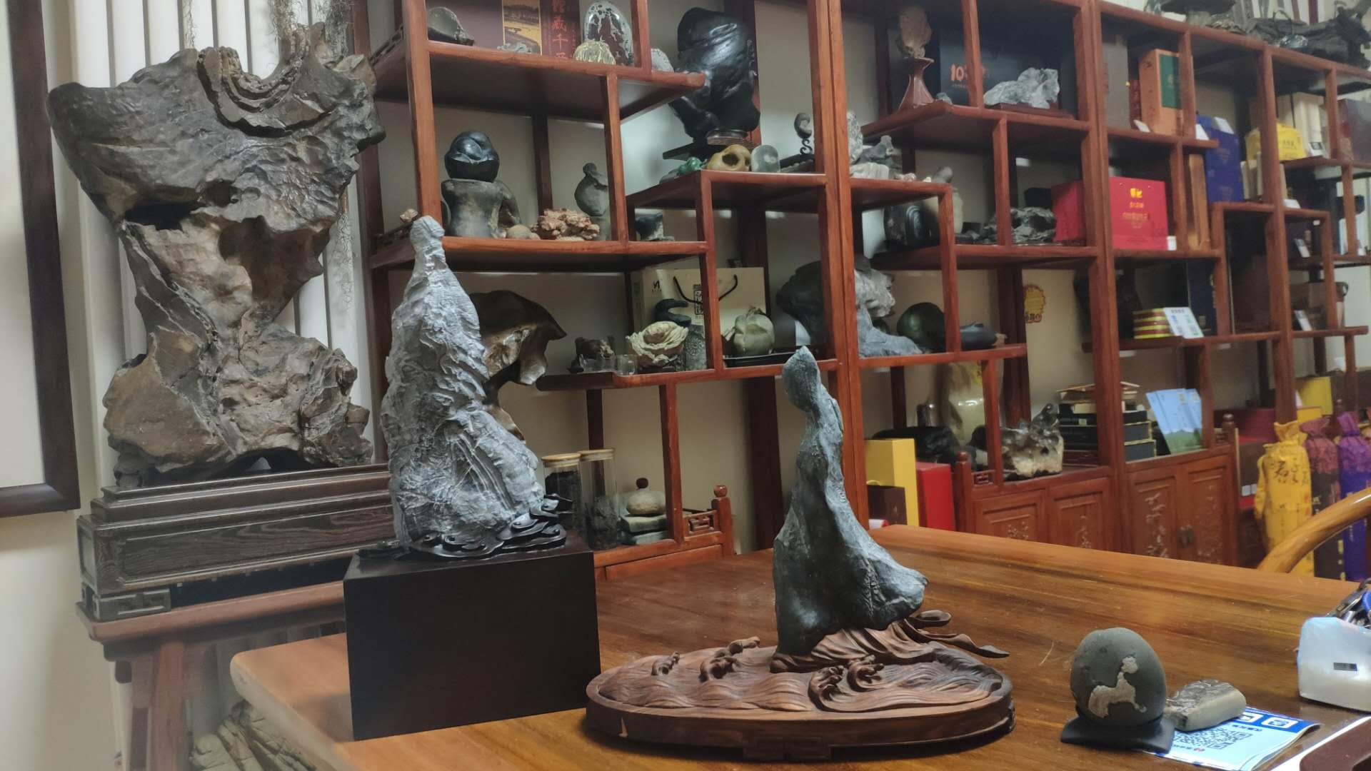 他在市区经营着一家茶店——茶石艺品,店里除了茶外,还藏着他的众多“宝贝”——灵璧石、太湖石、风凌石、戈壁石……在他看来,这些饱经风霜的石头本身就是艺术品,“每块石头都是独一无二的,它的图案、形状都向人们充分展示了自己的独特。”
