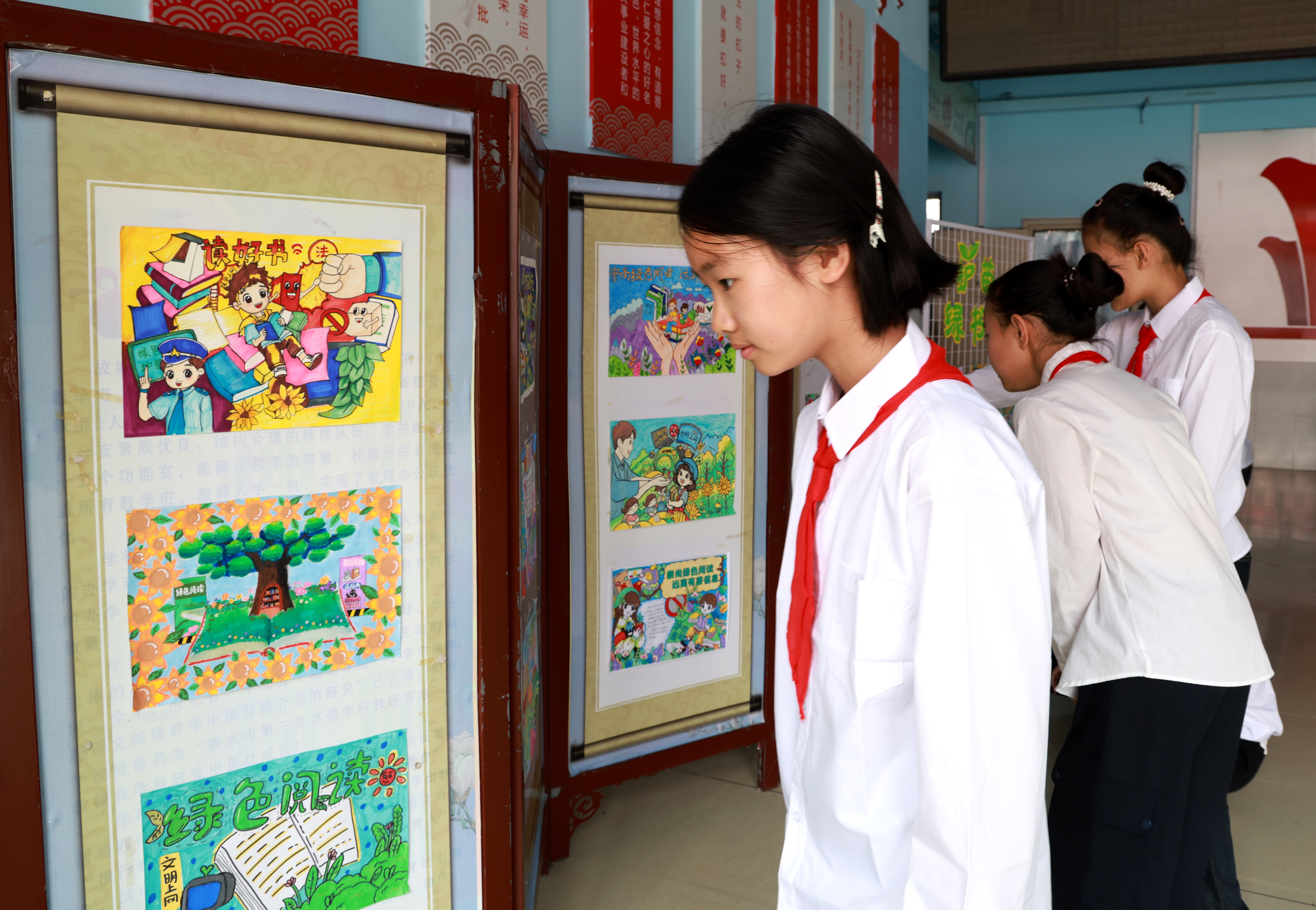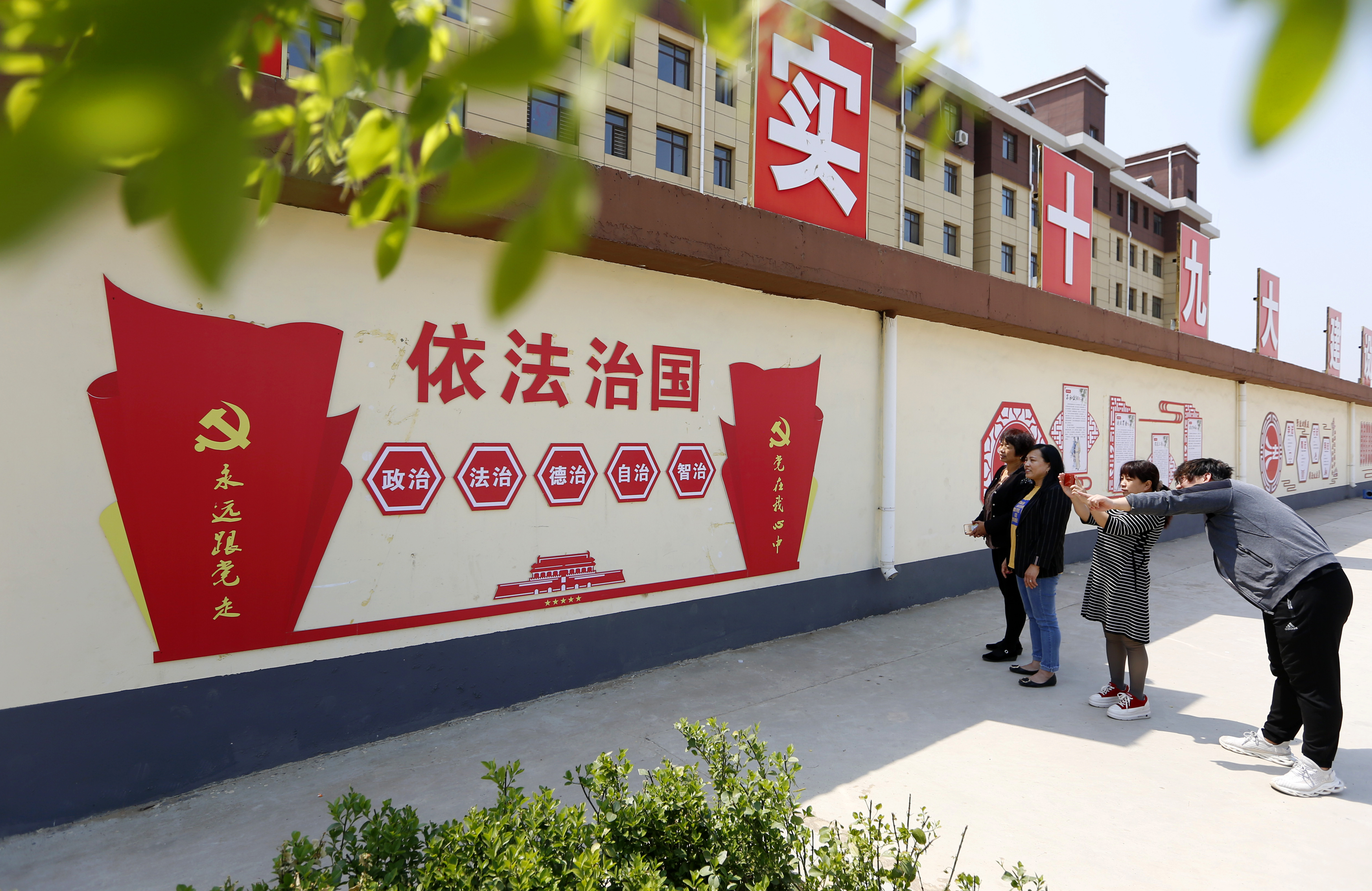衡水市阜城县王集乡南小张村村民在法治文化广场前驻足观看文化墙。