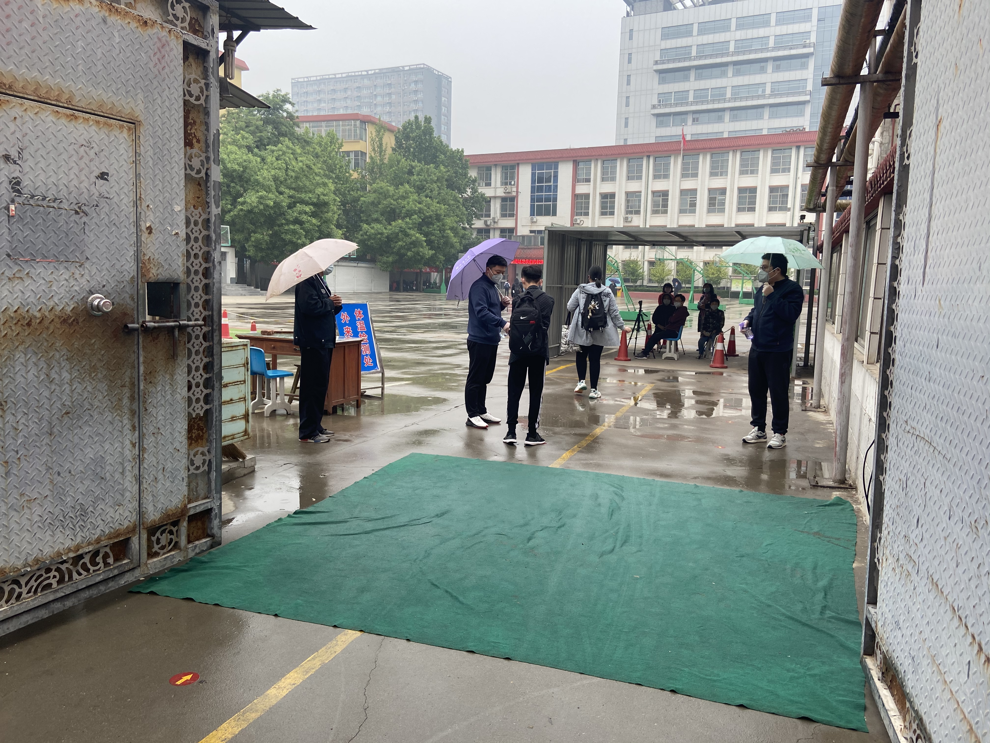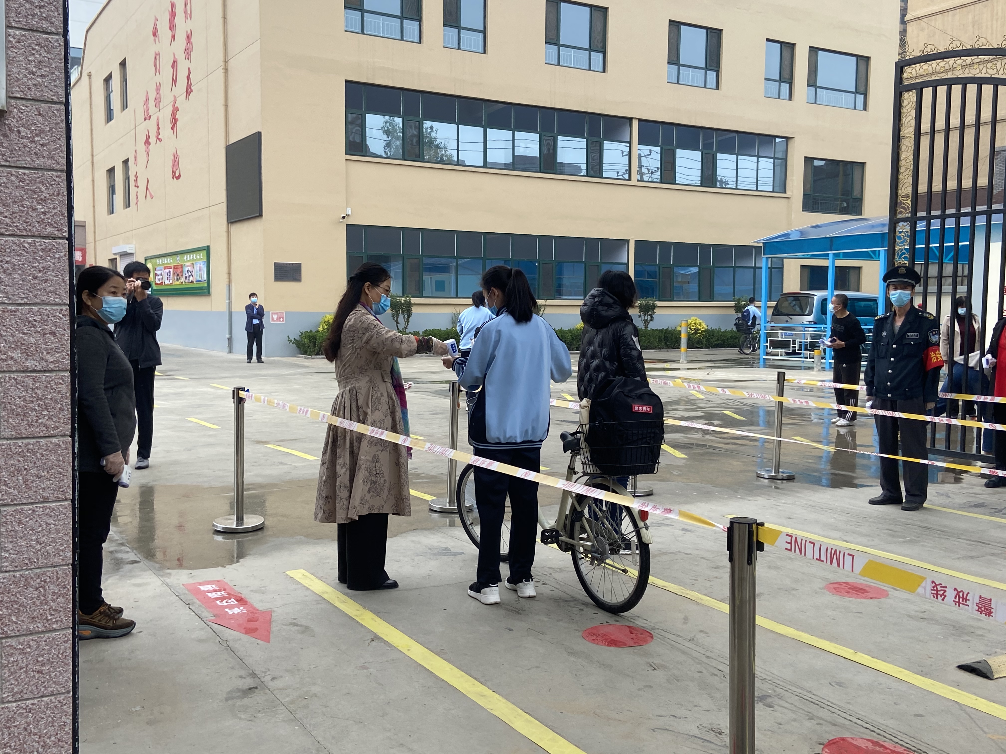 在衡水市第三中学,初三学生身穿校服、佩戴口罩,保持安全距离分通道依次排队进入。为避免复课学生产生拥挤,学校在大门口用隔离带隔出7条通道,每个通道有一名老师负责为学生测量体温。在教室门口,班主任会为每一名学生再次测量体温,“我们的学生在出家门前还会测量一次体温,达到一日三测温,确保学生安全返校复课。”一名老师告诉记者。