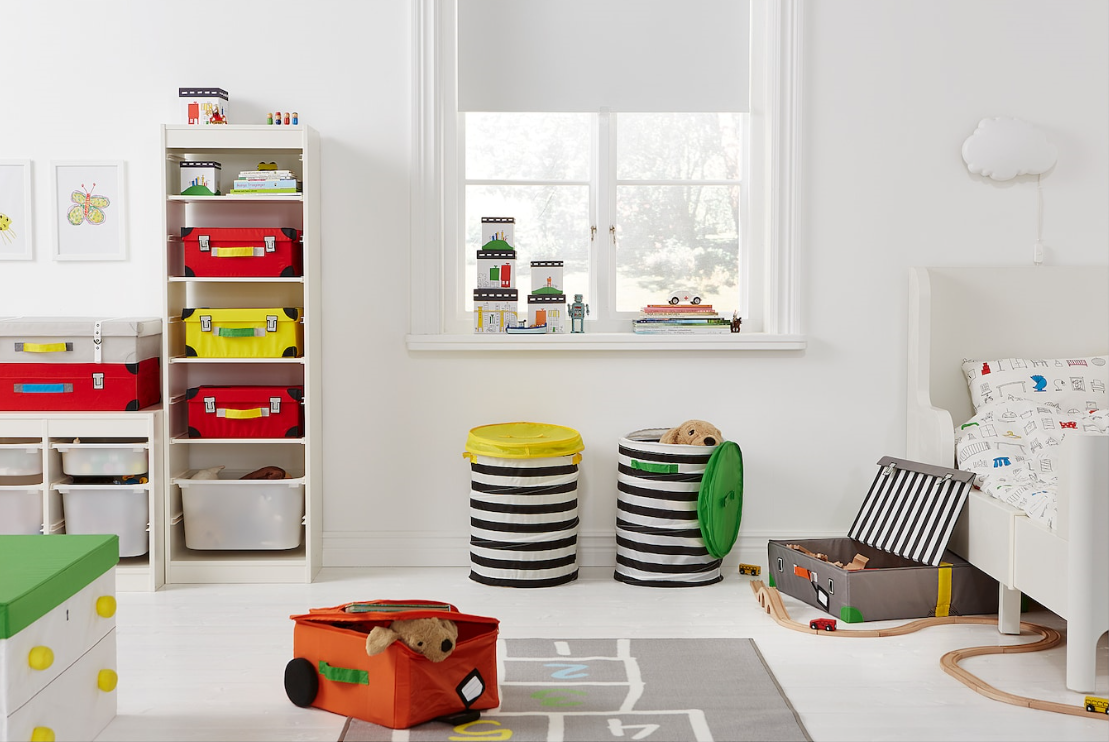 除了扁平的储物盒,圆柱型的储物篮也可以节省空间。彩色的独立式网篮可用于存放各种物件,如玩具、衣物和个人物品等。同时,盖子上装有贴扣,既能方便开合,又能防止落灰。此外,不使用时,也可折叠起来,节省空间。