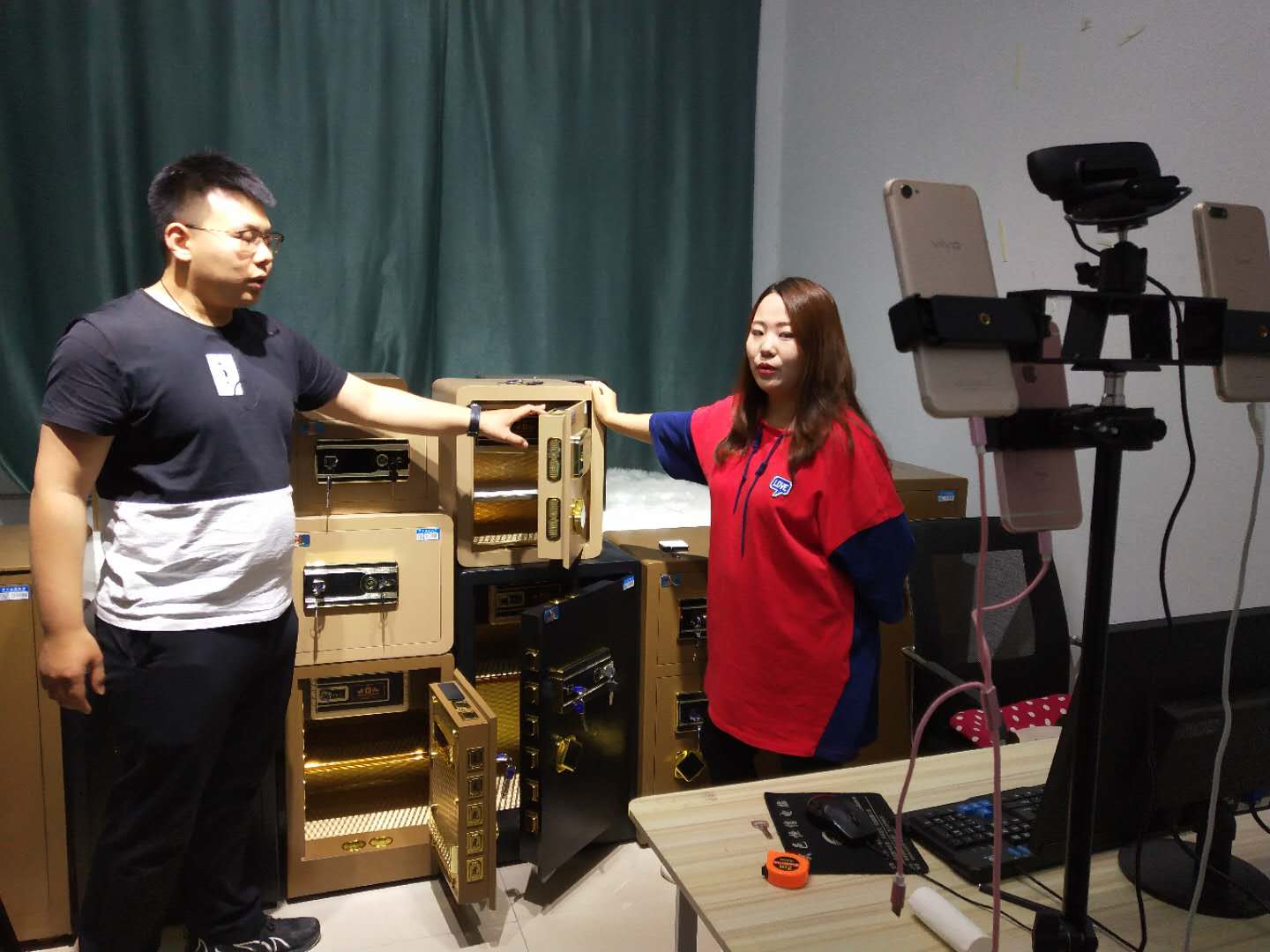 图为河北鼎泽金属制品公司员工在淘宝直播间展示各种保险柜。