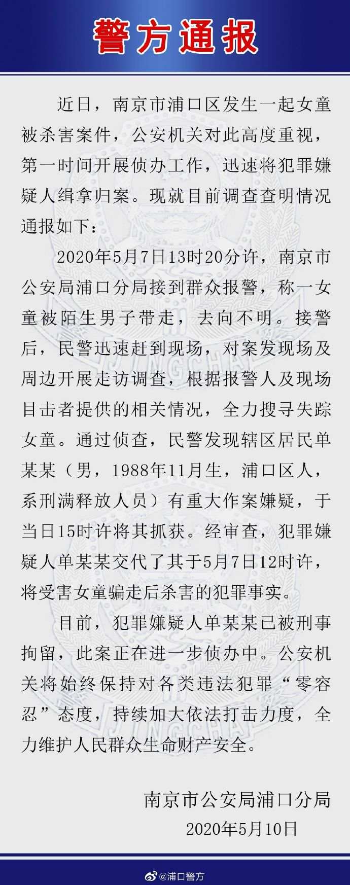 5月10日,南京市公安局浦口分局官方微博@浦口警方 通报称,犯罪嫌疑人单某某1988年出生,系刑满释放人员,其交代了将受害女童骗走后杀害的事实。目前,犯罪嫌疑人已被刑事拘留,此案正在进一步侦办中。通报全文如下: