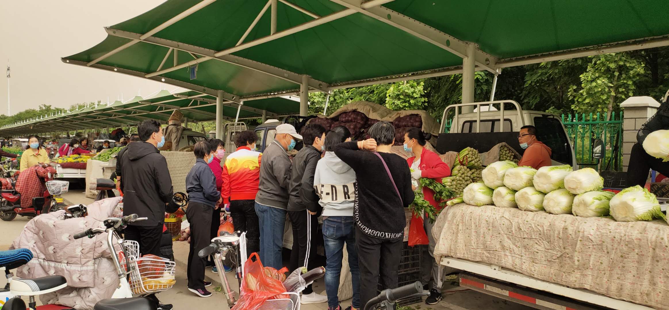 芹菜、菜花、土豆新鲜得都像是刚从地里采来,甜瓜、西瓜的香气弥漫在空气中,一进市场,记者便被扑面而来的新鲜果蔬视觉冲击所打动,开启了买买买模式。这期间,一些零零散散的顾客开始光临。较早一批顾客,以老年人为主。他们大多是这里的常客,很多人拉着专门的购物小车,有备而来。“你这年轻人,一看就没经验,买菜后一直拎着多沉啊,这种小车网上就有卖,超市搞活动有时还会赠,我这个就是赠的。”见记者拎着大包小包,一位阿姨好心提醒。