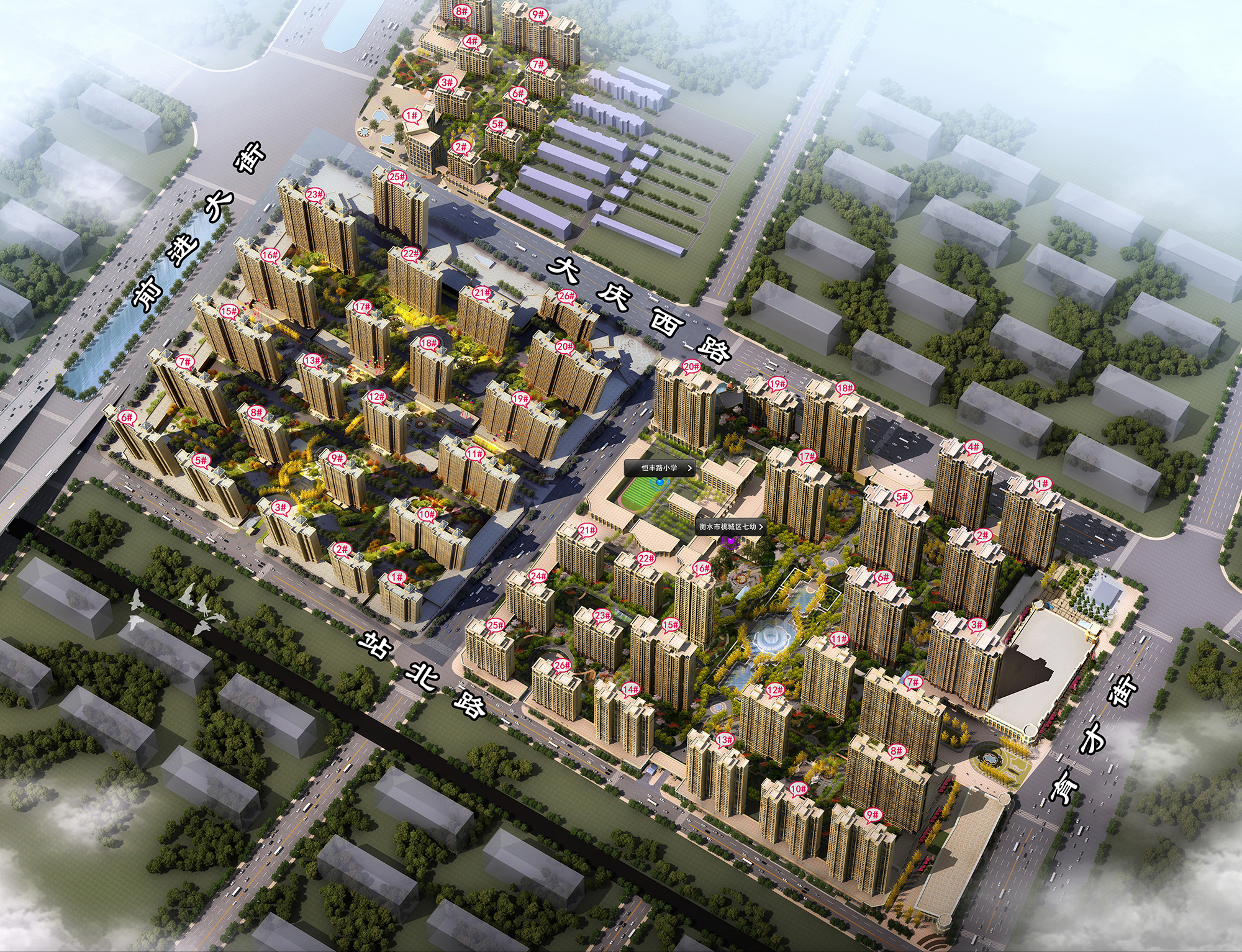 恒丰·理想城,总建筑面积约150万平米,规划总户数9500余户。东临市政大街-育才大街、南接站北路、西侧迎宾大道-前进大街、北侧贯穿衡水东西交通要道-大庆路。拥有良好的区位优势和便利的路网交通。北行约1.8公里到达衡水高铁站,约4.3公里到达邢衡高速入口,出门即到公交站7路、8路、27路、28路。大庆路对面即为爱特购物中心(在建),东行约2公里为怡然称,南行约1.5公里为衡百国际,迎宾大道对面即为铁北公园。