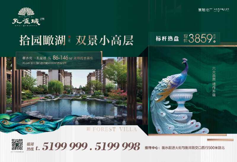 景旭孔雀城位于前进街以北高铁商圈,36万㎡新中式府邸,于高铁新区辟疆拓土,率先抢占规划富地,外享20万㎡双公园环抱,内泊4000㎡湖境美景,孔雀城,为城市致献全龄滋养型的宜居奢享型社区。