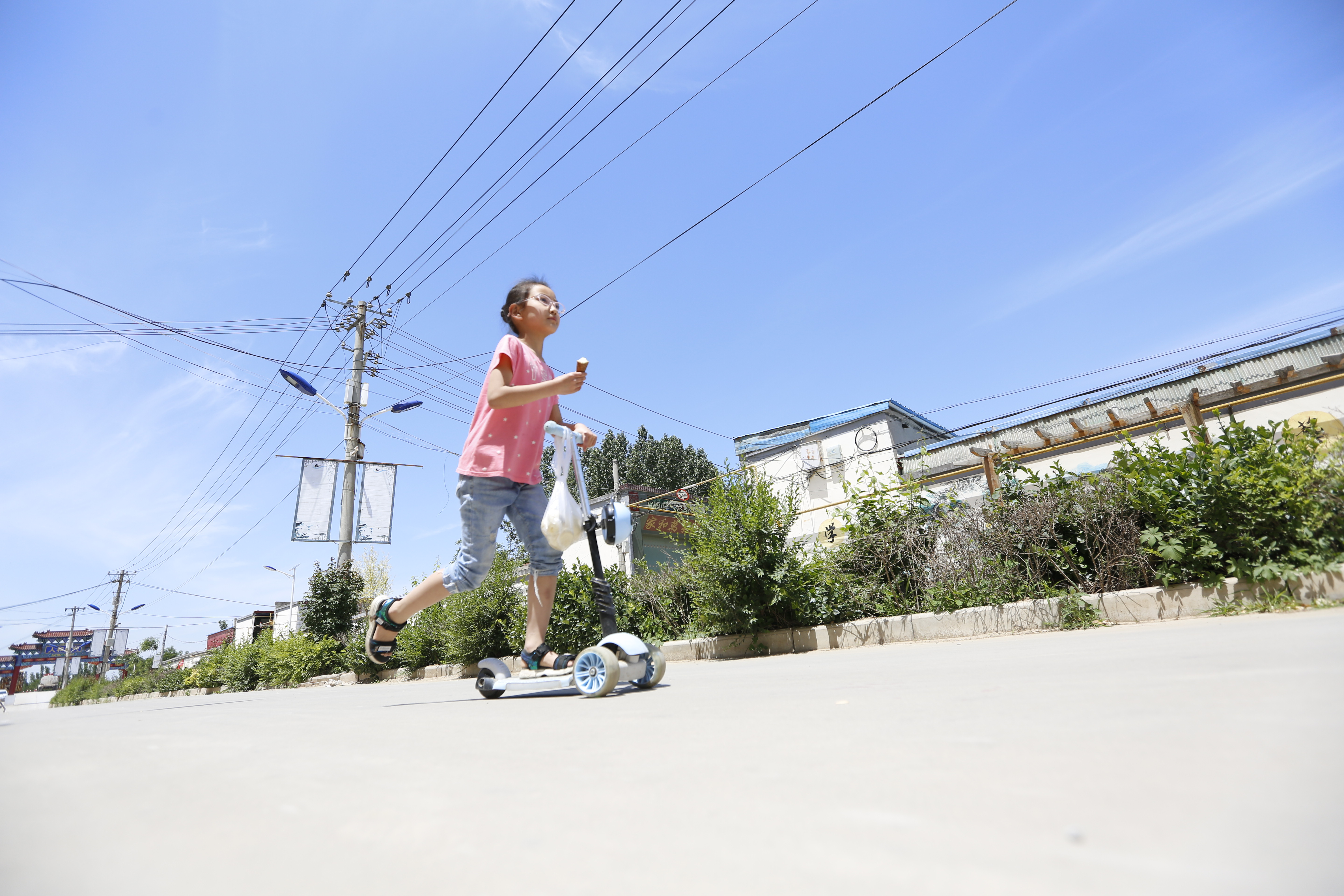 衡水市安平县建张庄村的儿童在宽阔的马路上骑滑板车。