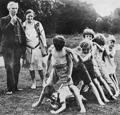 罗素与第二任妻子多拉·勃拉克看孩子们嬉戏。尽管罗素大谈“幸福哲学”,但他本人肆无节制的社交生活却给多位女性带来不幸。在他与第二任妻子多拉结婚之前,他先是勾引有夫之妇奥托琳·蜜乐儿夫人,因此抛弃了发妻爱丽丝。在与奥托琳发生关系的同时,他又与海伦·达德利发生关系,始乱终弃,并导致后者精神失常。抛弃海伦后,他又同时分享蜜乐儿和克莱特两位女性对自己的爱情。直到1920年,他投入了更年轻、更富有魅力的多拉·勃拉克怀抱中。但随着多拉发现罗素私生活中越来越多不检点之处,两人的婚姻也迅速走向破裂。罗素不仅趁多拉不在家时与负责教导孩子的家庭女教师同床共枕,还惦记上了自己的学生皮特·斯彭斯。皮特后来挤掉多拉,成了罗素的第三任妻子。在与罗素的多年相处后,多拉如此评价自己的前夫罗素:“尽管他热爱民众并为他们的苦难感到痛苦,但他依旧远离他们,因为他身上有贵族气质,同平头百姓缺乏联系……他一生中会伤害很多人,他最大的悲剧性缺点,是很少感到歉意”。