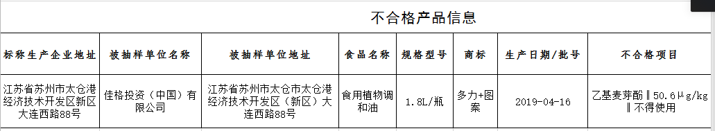 据了解,此次抽检包含食用油、油脂及其制品样品共48批次。新京报记者注意到,被抽检品牌中包含益海嘉里、道道全、中粮、鲁花等,仅有1批次不合格。根据通告,由佳格投资(中国)有限公司经销的、标称佳格食品(中国)有限公司生产的多力(臻宝)食用植物调和油(1.8L/瓶,2019-04-16),检出禁用物质乙基麦芽酚(50.6μg/kg),不符合食品安全国家标准规定。