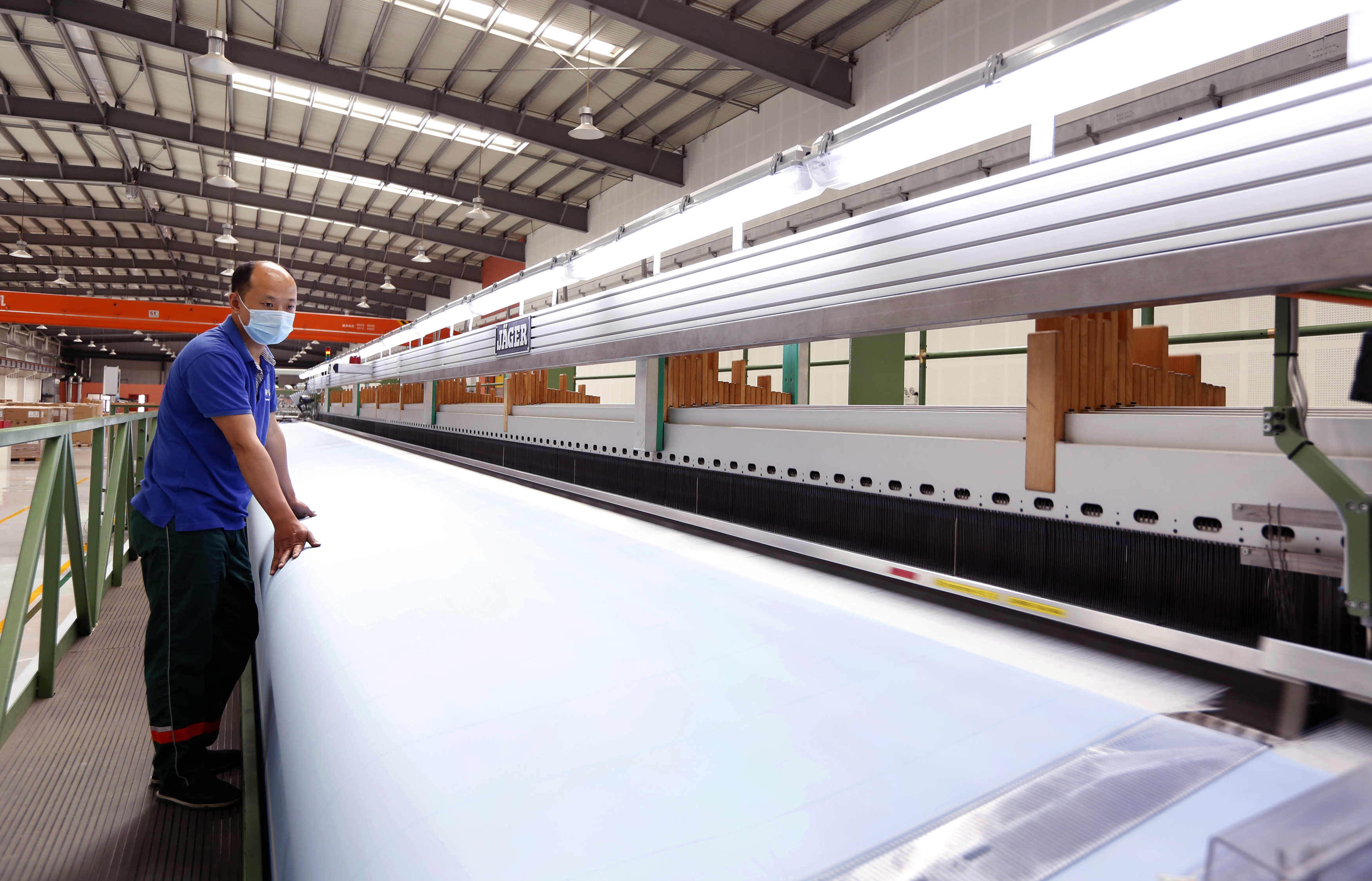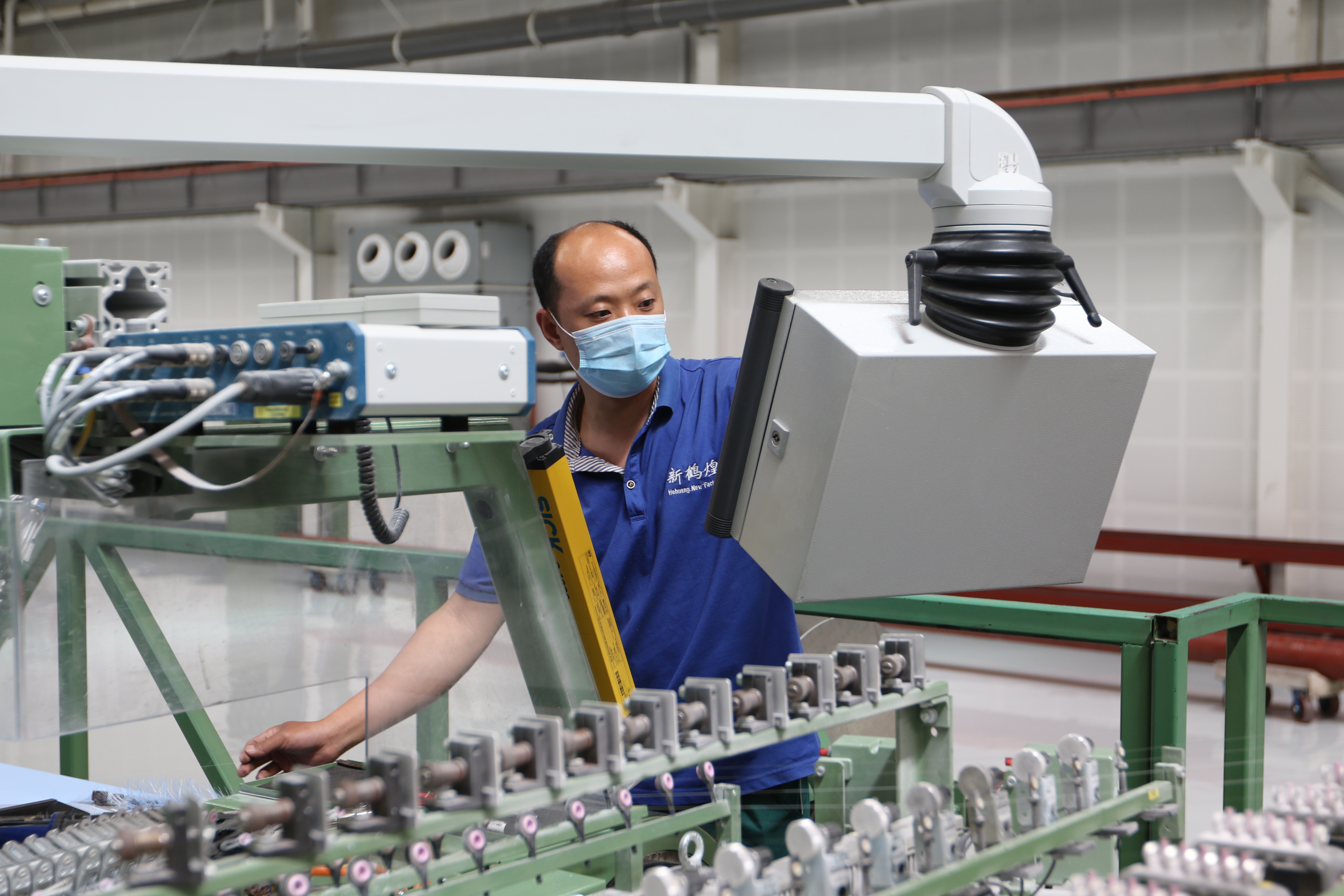 工人在衡水市安平县河北鹤煌网业股份有限公司生产车间内工作。