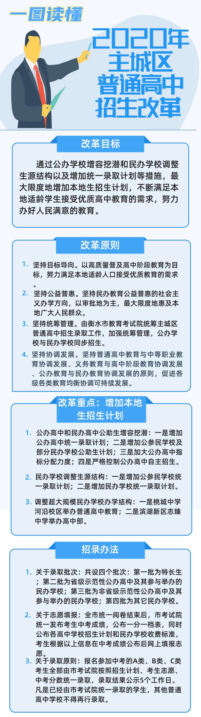 近年来,市委、市政府深入实施教育规范提升工程,把扩大普通高中本地招生人数作为重要的民生。此次改革,将加强统筹管理,公办学校与民办学校同步招生,坚持普通高中教育与中等职业教育协调发展、义务教育与高中阶段教育协调发展、公办教育与民办教育协调发展的原则,促进各级各类教育均衡协调可持续发展。
