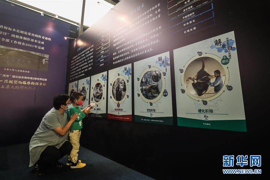 6月4日,参观者在《巨鲸传奇》特展中观看展出的抹香鲸塑化标本。