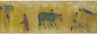 宋代宫廷画院出现,山水画成就突出,花鸟画追慕自然,人物画注重传神,至元代,虽有“文人画”的兴盛,然而由于赵孟頫的倡导与身体力行,宋代职业画家强调写实的传统并没有因朝廷的不重视而荒疏。因治理元大都通惠河而被朝廷升为都水监少监的著名水利专家任仁发,在公务之余所创作的鞍马画,成为本次展陈中的亮点。《饮饲图卷》上绘有骏马九匹,僧侣一人,养马官一人,饲马者三人。此图记录了元代皇家豢马机构的日常工作情况。马匹的造型精准,勾勒劲细,展现了画家承接自唐代鞍马绘画的成熟技法。另一路“文人绘画”自唐代王维肇始,五代董源承接,北宋苏轼倡导,至元代赵孟頫,已由中国传统绘画发展中的一支分流,形成长江、黄河之势,在“元四家”手中如日中天。