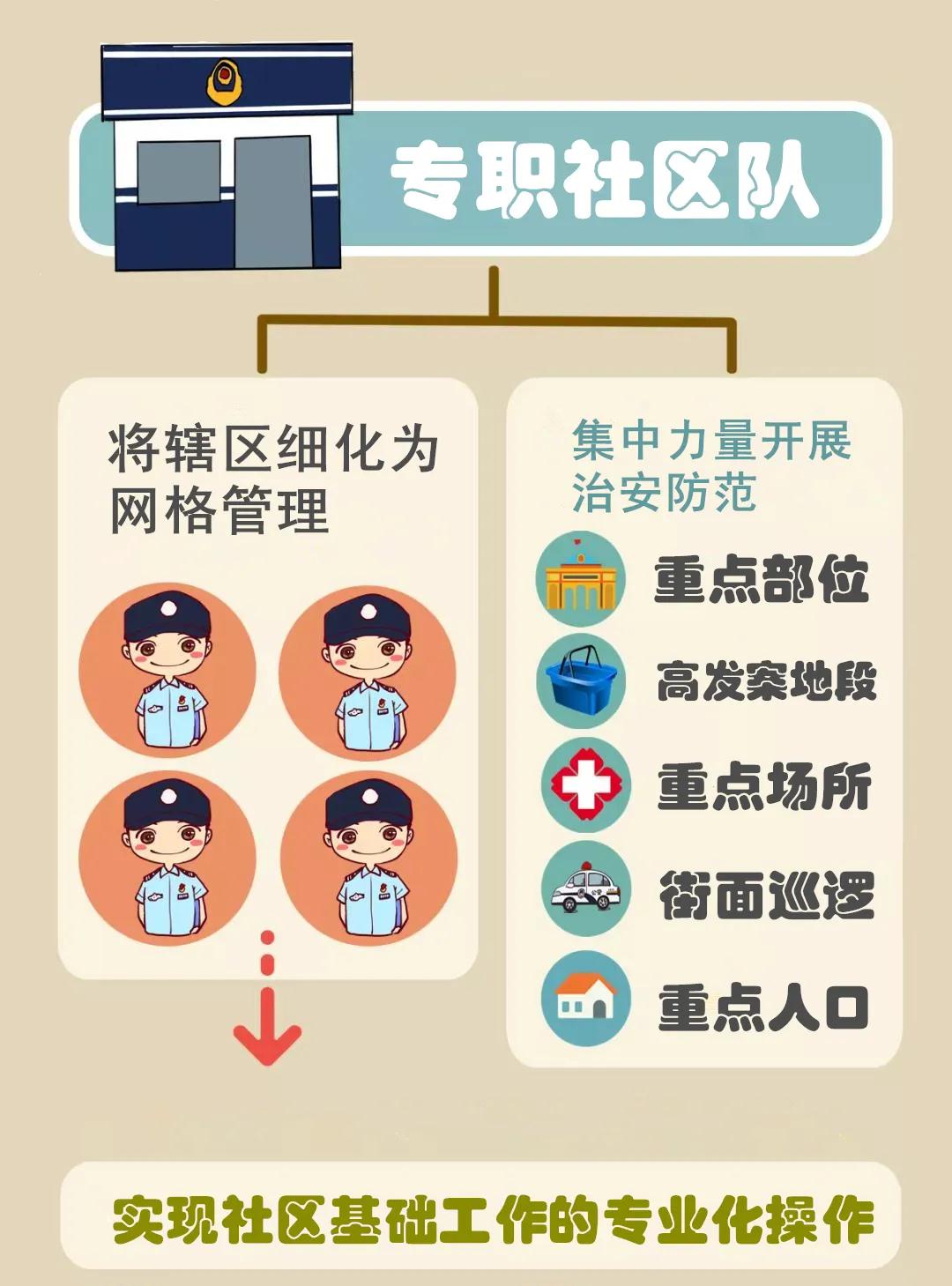 这个分工模式打破了原有“工作千条线、片警一根针”的局面,形成了“模块集成、专司合一”的战斗新编组。一室、两队既各负其责,又互相配合,优势互补。在新模式下,派出所扭转了一边打、一边防、人手少、难兼顾的局面,更有效地回归防范主业。派出所案件办理队成为打击违法犯罪的主体,专职办理各类案件和线索核查,成为攻坚队。社区警务队原则上不参与本辖区的治安、刑事案件的办理,只做专业的“社区警”, 依托人熟、地熟、情况熟的优势,大力开展信息收集等基础工作,成为社区管理服务和基础防范的主力军。综合指挥室作为派出所管理的中枢部门,根据上级指令对“两队”警力进行指挥调度,成为公安工作最前沿的“指挥中心”。
