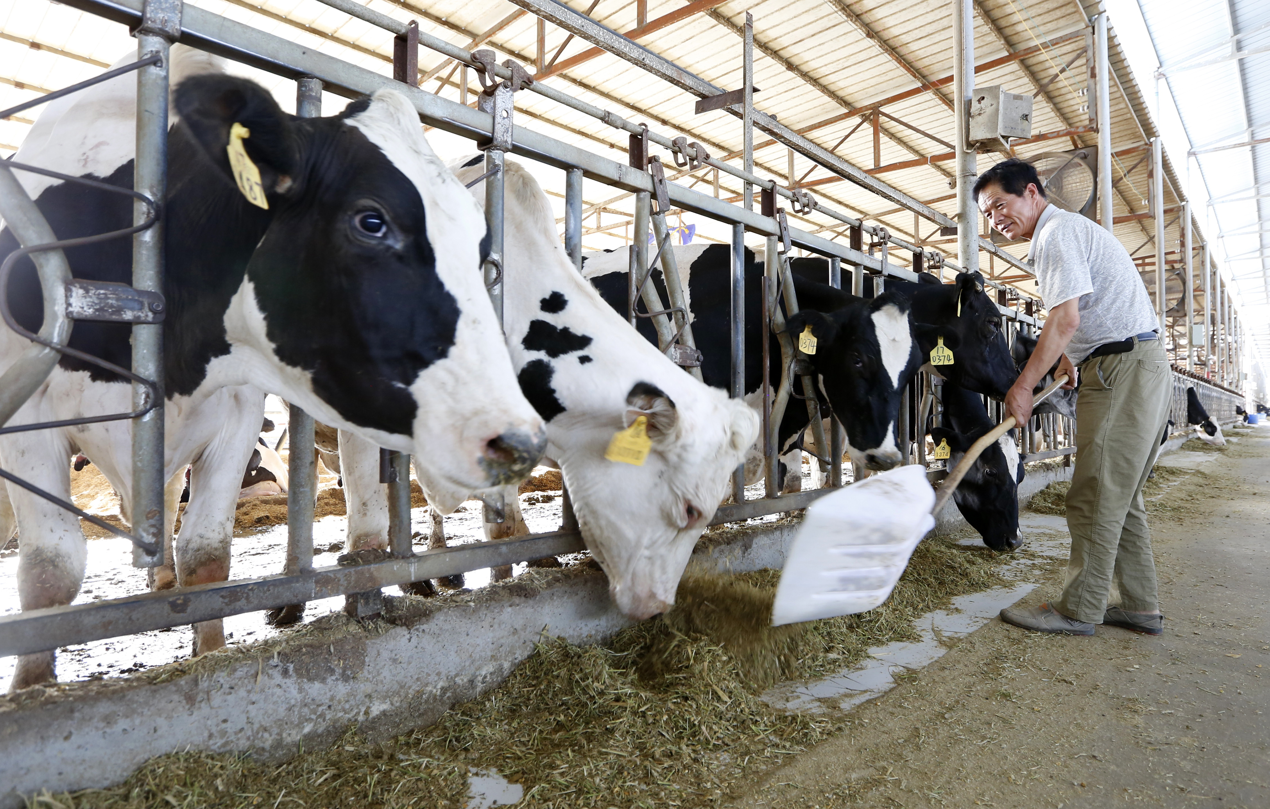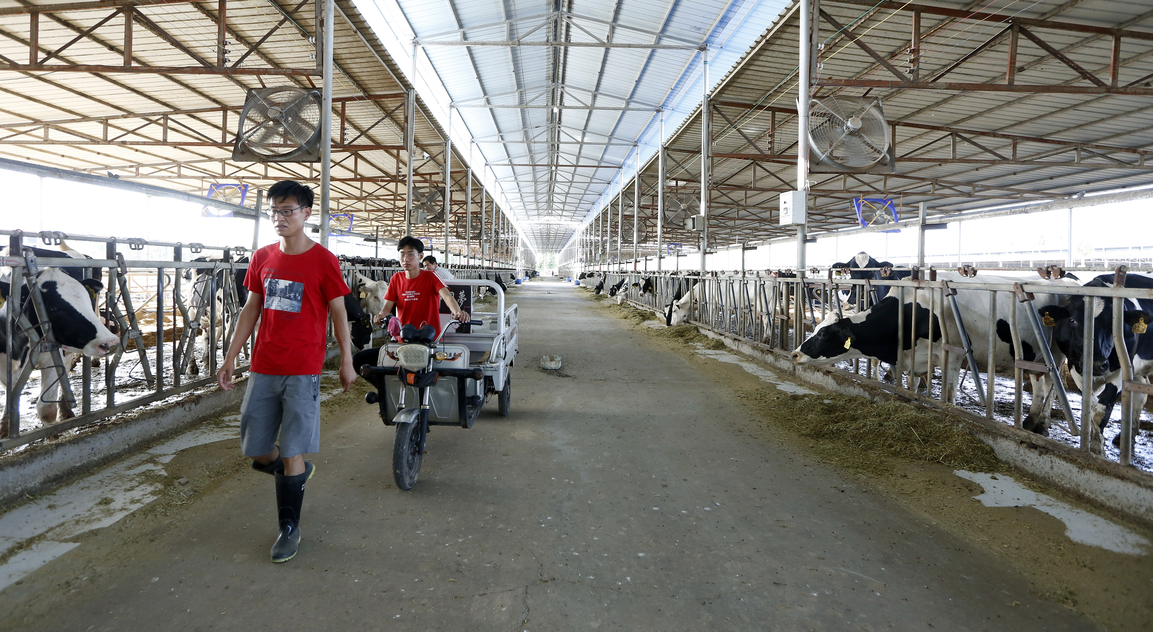 枣强县河北百荣牧业科技有限公司养殖基地的工人正在饲喂奶牛。