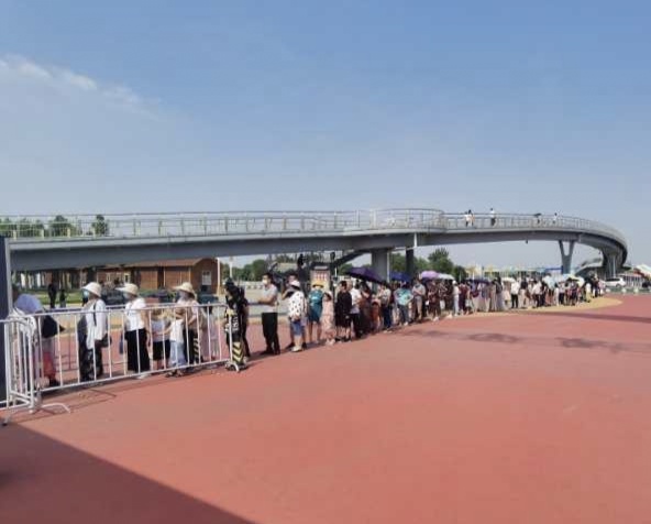当天,天公作美,衡水大地阳光灿烂、凉风习习。上午8时许,景区工作人员已到位,他们个个精神抖擞、春风满面,以良好的状态迎接游客。一日之计在于晨,伴着夏日的清风,游客们也早早来到景区,一会儿工夫景区入口处就排起了长龙。“请大家自觉保持距离。”工作人员不时提醒着。