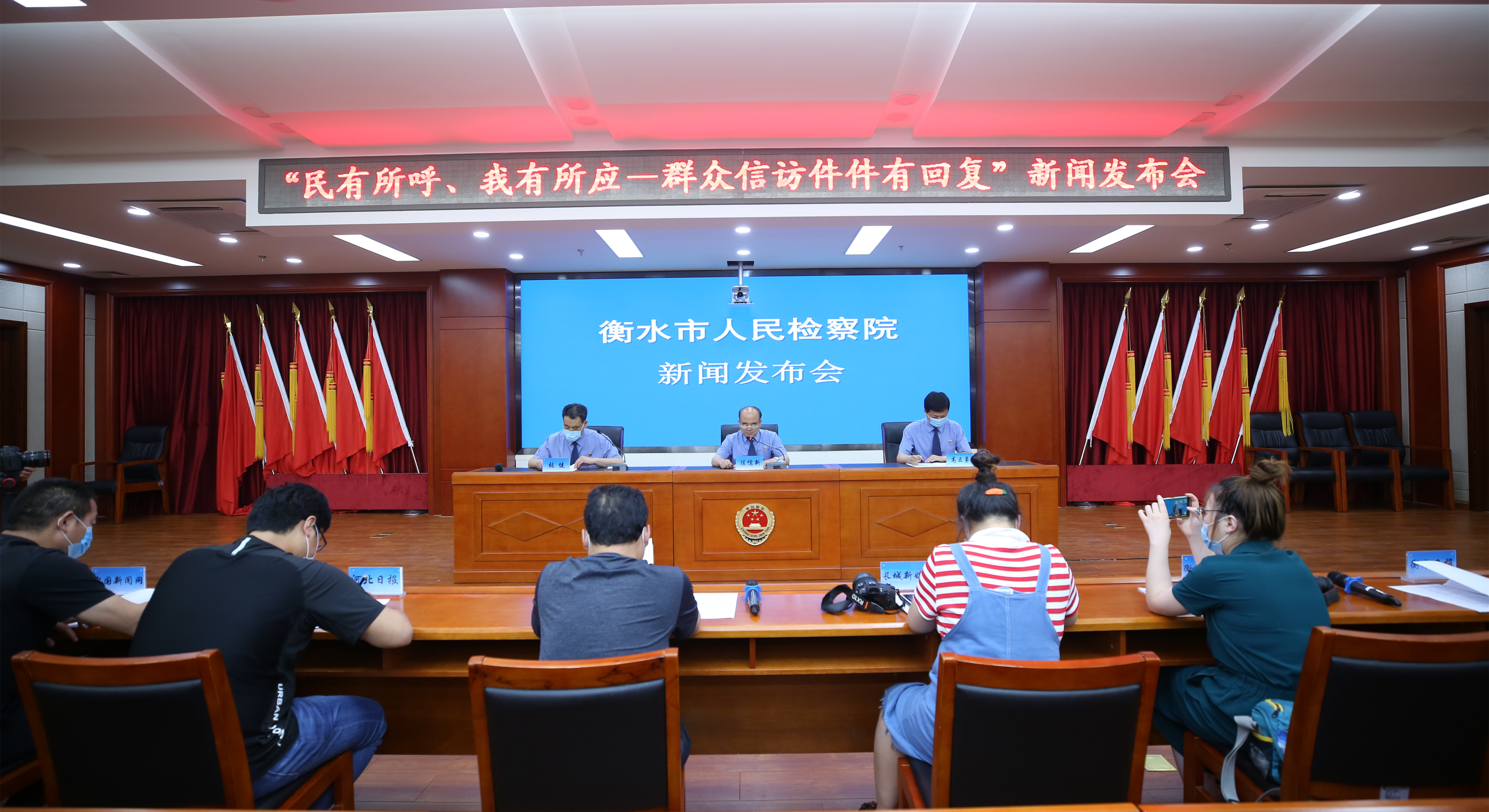 6月11日下午,衡水市检察院召开新闻发布会,市检察院新闻发言人、检委会专职委员陈儒新通报全市检察机关贯彻落实“群众信访件件有回复”制度及工作开展情况,市检察院第九检察部主任高立勇回答记者提问,市检察院宣教处处长张健主持发布会。河北日报、衡水日报等多家省、市级媒体应邀参加新闻发布会。