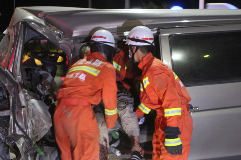 消防救援人员到达现场后发现,面包车驾驶室严重变形,驾驶员左腿被卡。消防救援人员首先利用液压扩张钳对变形主驾驶门进行扩张处理,随后救援人员进入驾驶室确认司机的伤势和双腿被卡部位,选择最佳操作位置进行救援,利用液压顶杆顶撑中控平台,最终将被困人员成功救出并交由医护人员处置。