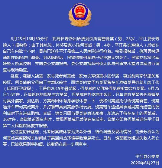 6月25日16时50分许,我局长寿派出所接到该所辅警饶某(男,25岁,平江县长寿镇人)报警称:由于其疏忽,将邻居家小孩何某威(男,4岁,平江县长寿镇人)反锁在自己车内数个小时,目前已送往平江县第二人民医院进行抢救。接到报警后,值班民警迅速赶往医院进行调查。到达医院后,民警得知何某威已经抢救无效死亡。民警立即将涉案嫌疑人饶某控制,并向县公安局报告。县公安局指派刑侦大队与刑事技术室对该案进行调查与现场勘查。
