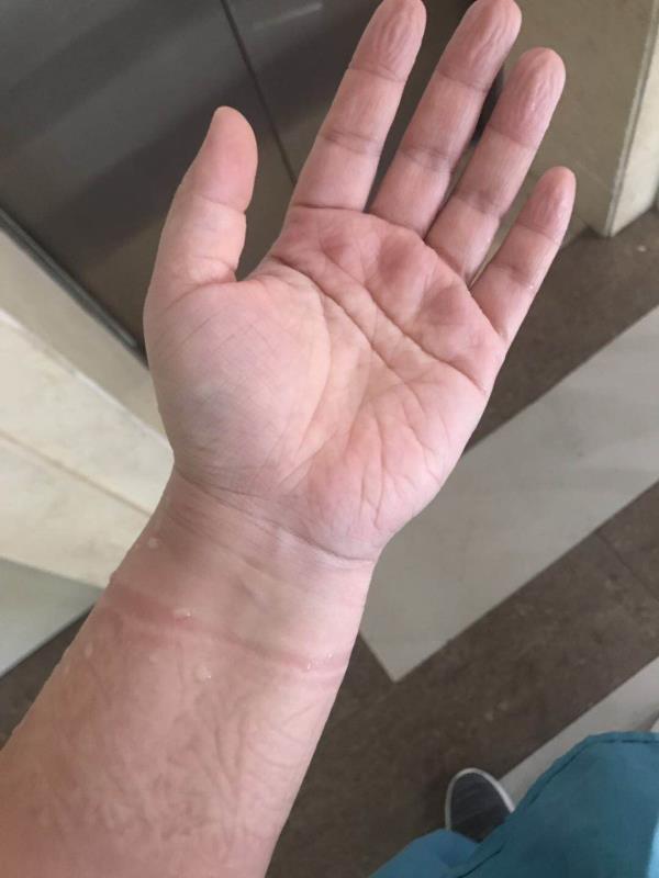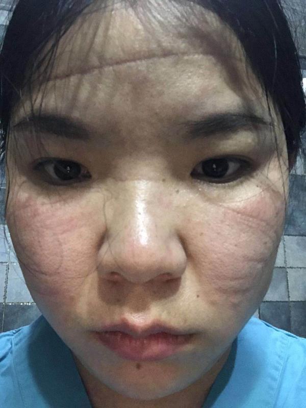 “我们都做过专业培训,操作上十分熟练,所以尽管需要采集的数量大,但我并不发憷,加着小心取就行。”周红说,最让她头疼的是面罩上的水雾,“越到后头,雾气越大,后来都汇聚成了水滴,顺着面罩往下流,视线特别模糊。”最后实在看不清楚采集部位时,她只能凭自己敏锐的感觉,患者有轻微的恶心或躲避动作,说明棉签触及了咽喉部。采完后,她来不及歇息,立马包装、核对数量……一直忙碌到晚9时许才结束。“浑身湿漉漉的,没有力气,腿也发酸,一步都不想走了,就在地上坐了一会儿,又赶紧去交标本……” 脱去防护服后,她脸上满是压痕,手也肿胀泛白,但满脑子里闪动的依然是工作的一个个细节。