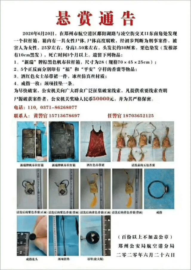 6月26日,郑州市公安局航空港分局发布一则悬赏通告称,20日在郑州航空港区郑州市航空港区鄱阳湖路与凌空街交叉口东南角处发现一个“新瑞”牌棕黑色帆布拉杆箱,箱内有一具女性尸体,尸体高度腐败,经初步判断为刑事案件。