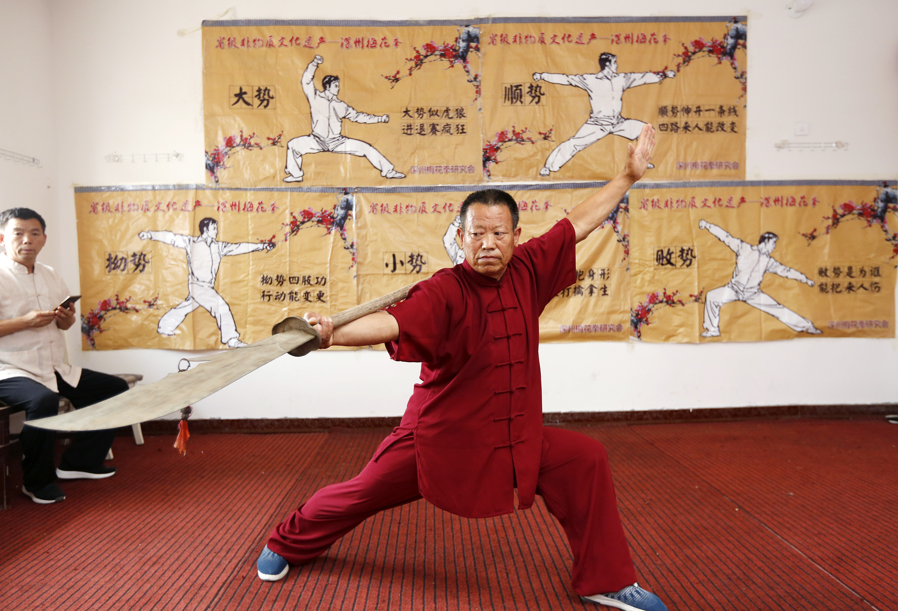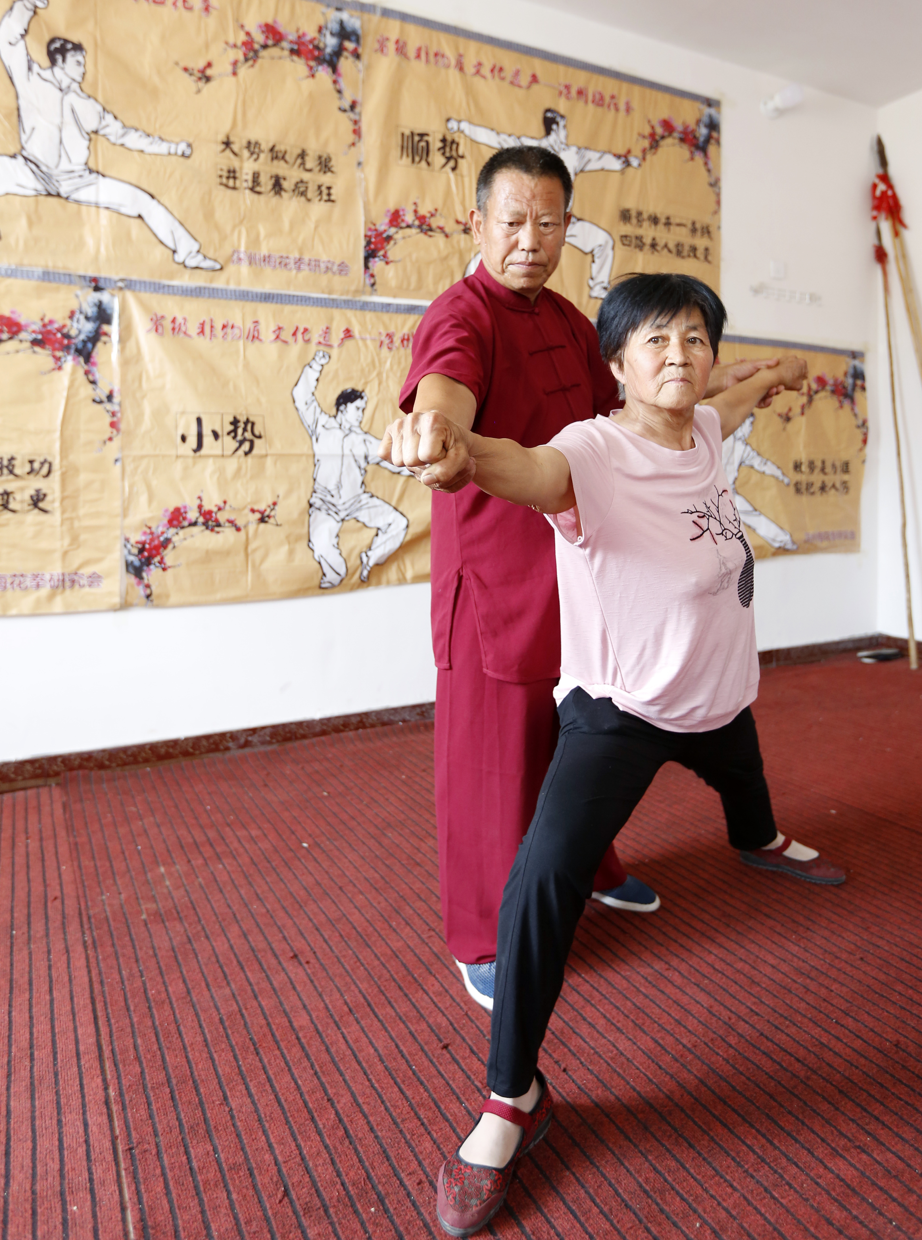 深州市梅花拳大师、第十七代梅花拳传承人尹春购在指导武术爱好者习练梅花拳。