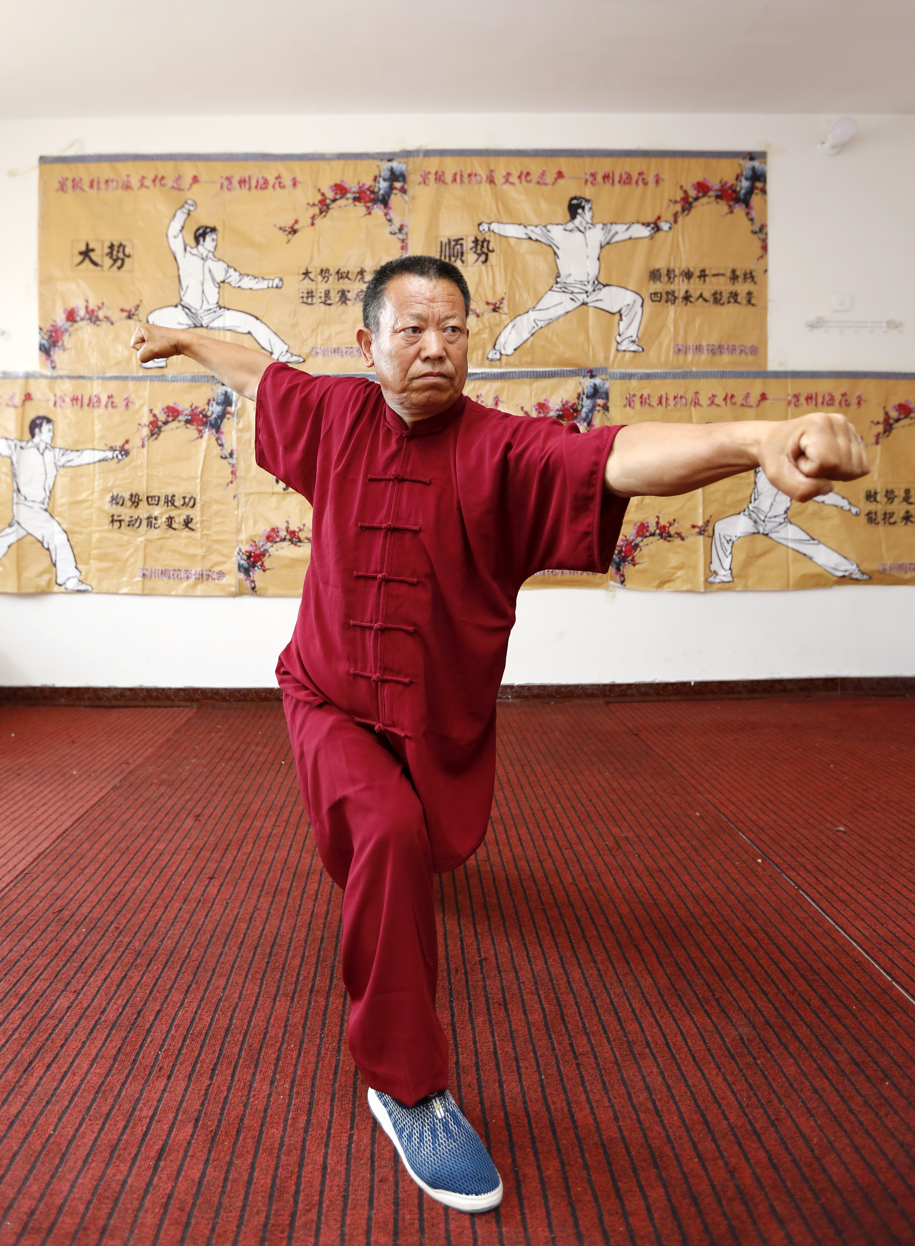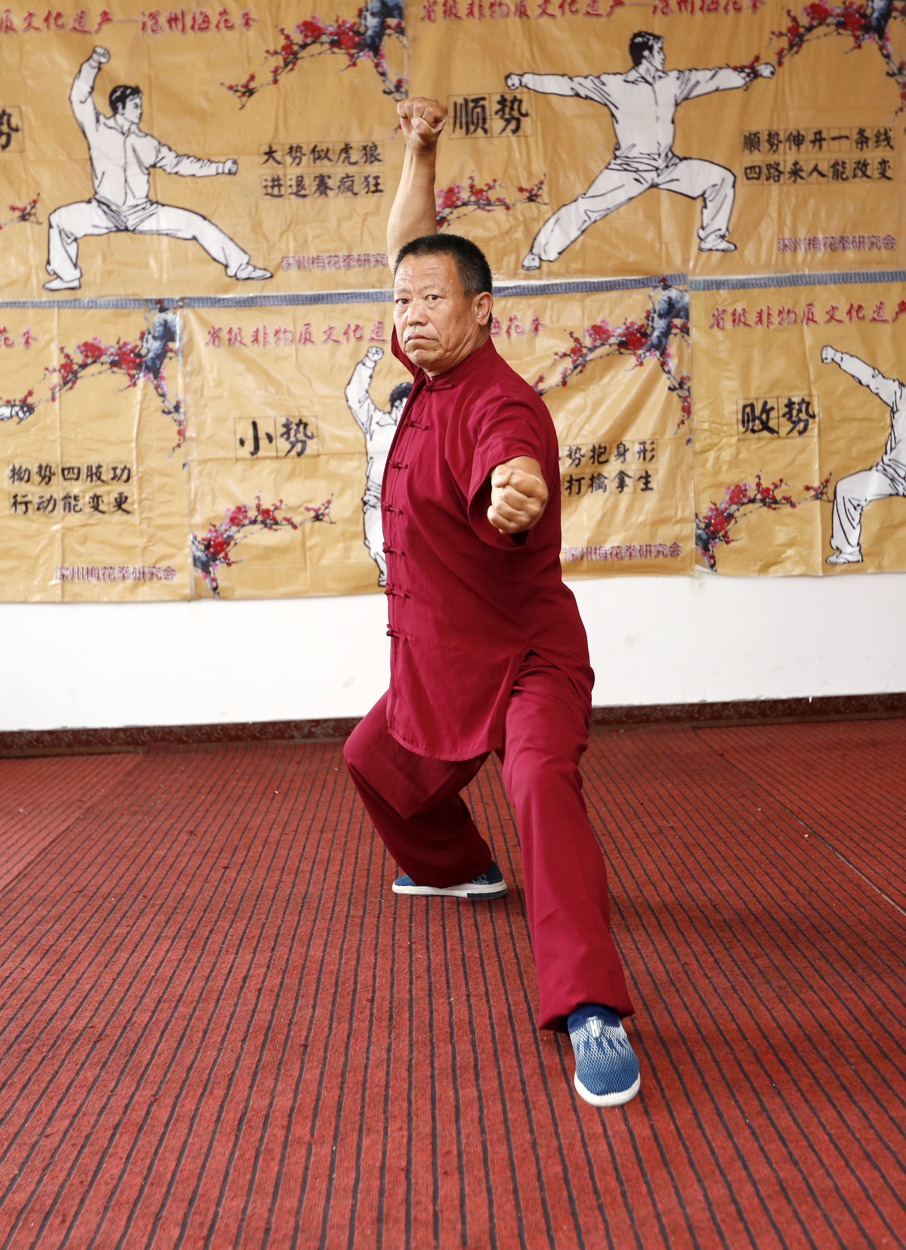 深州市梅花拳大师、第十七代梅花拳传承人尹春购展示梅花拳。