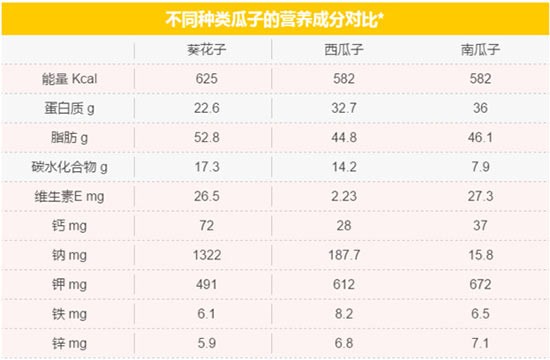 古往今来,从皇帝到百姓都“大爱”嗑瓜子,除去休闲娱乐的因素,瓜子中的营养成分也是不容小觑。以葵花子为例,其富含不饱和脂肪酸,人体必需的亚油酸含量约达到50%~60%。除富含不饱和脂肪酸外,葵花子中还含有多种维生素、铁、钾、锌等人体必需的营养成分(见表)。可见,瓜子虽小,营养不少。