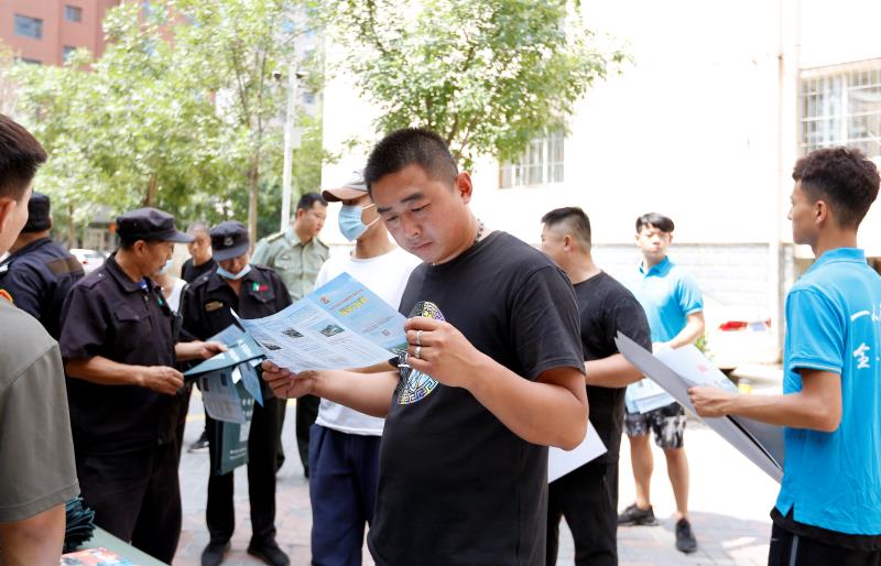 社区工作人员在市政府人民广场发放宣传资料。