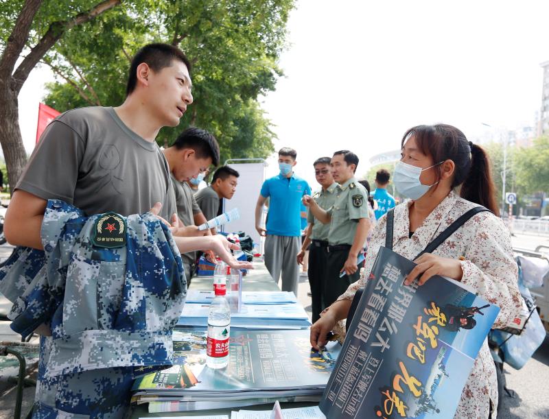 桃城区中华大街办事处武装部工作人员为市民讲解入伍相关政策。
