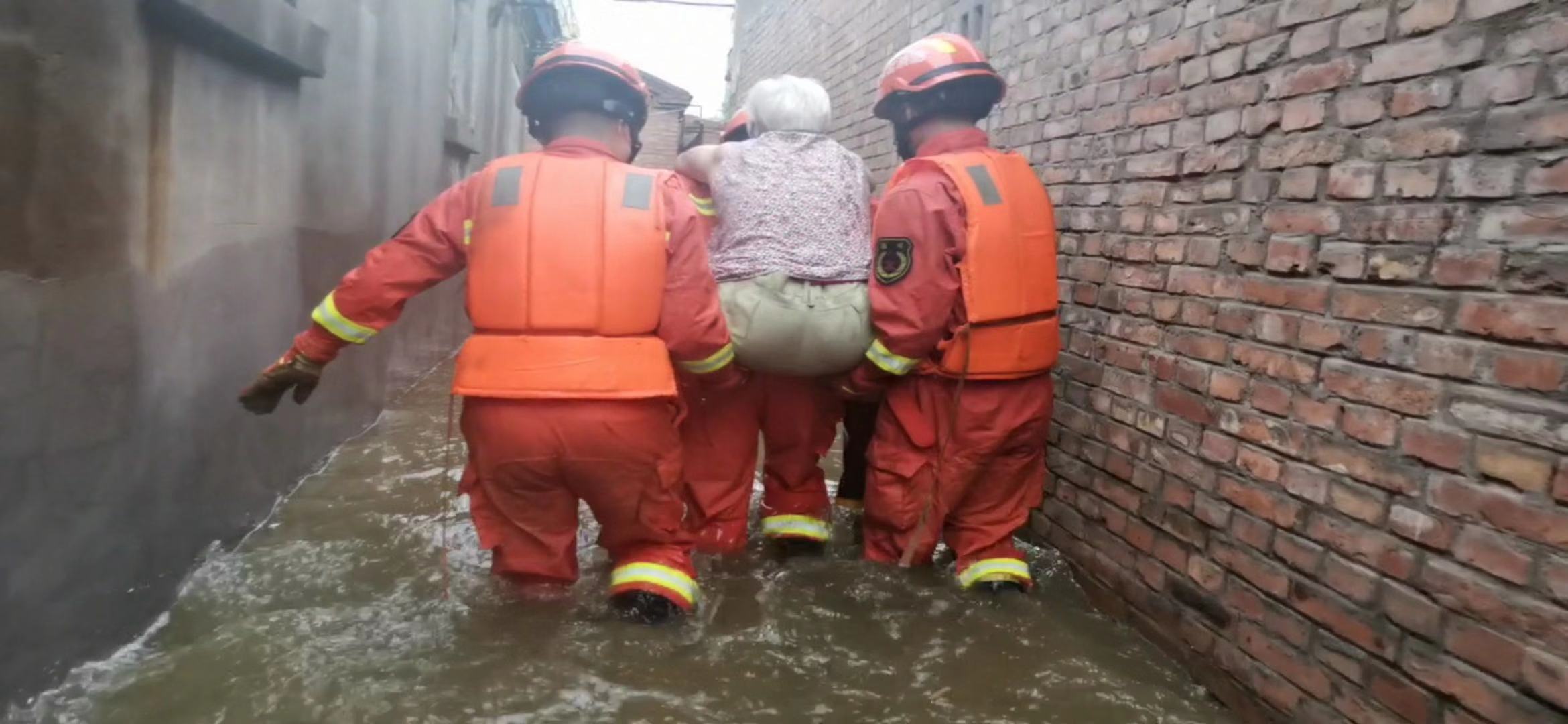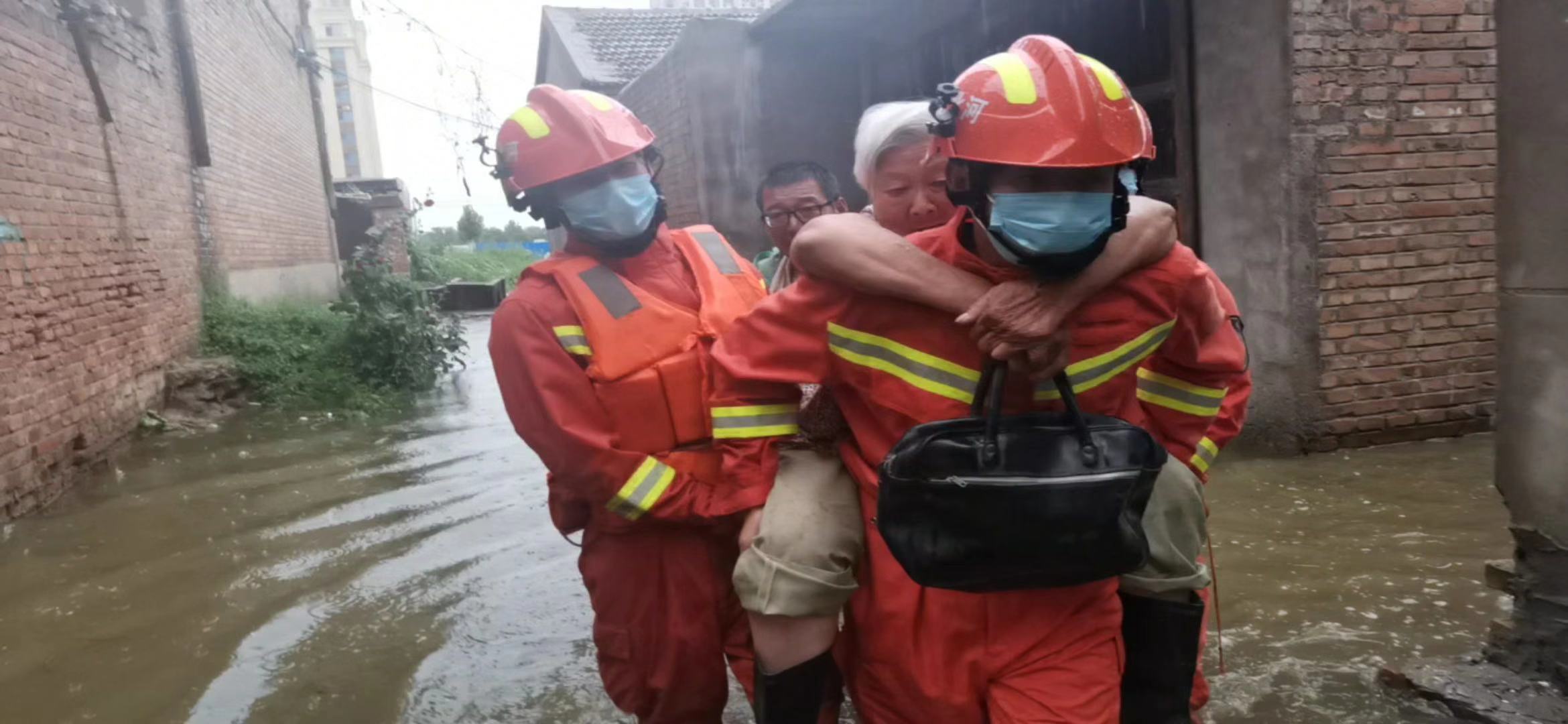强降雨造成民房被淹,一位七旬老人被困家中,冀州消防快速行动,对被淹区域逐一排查,将被困人员转移到安全地带。
