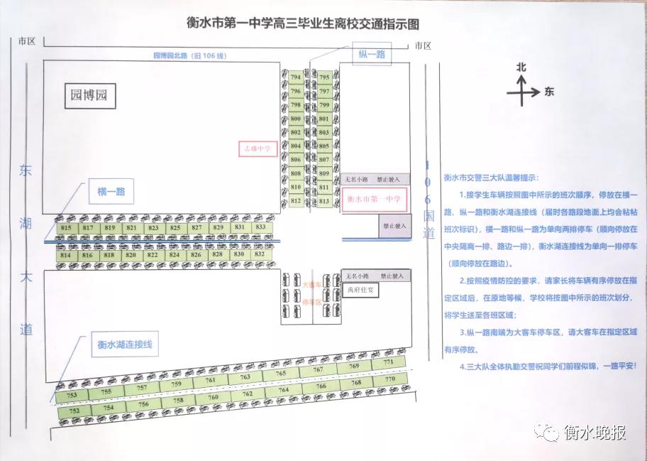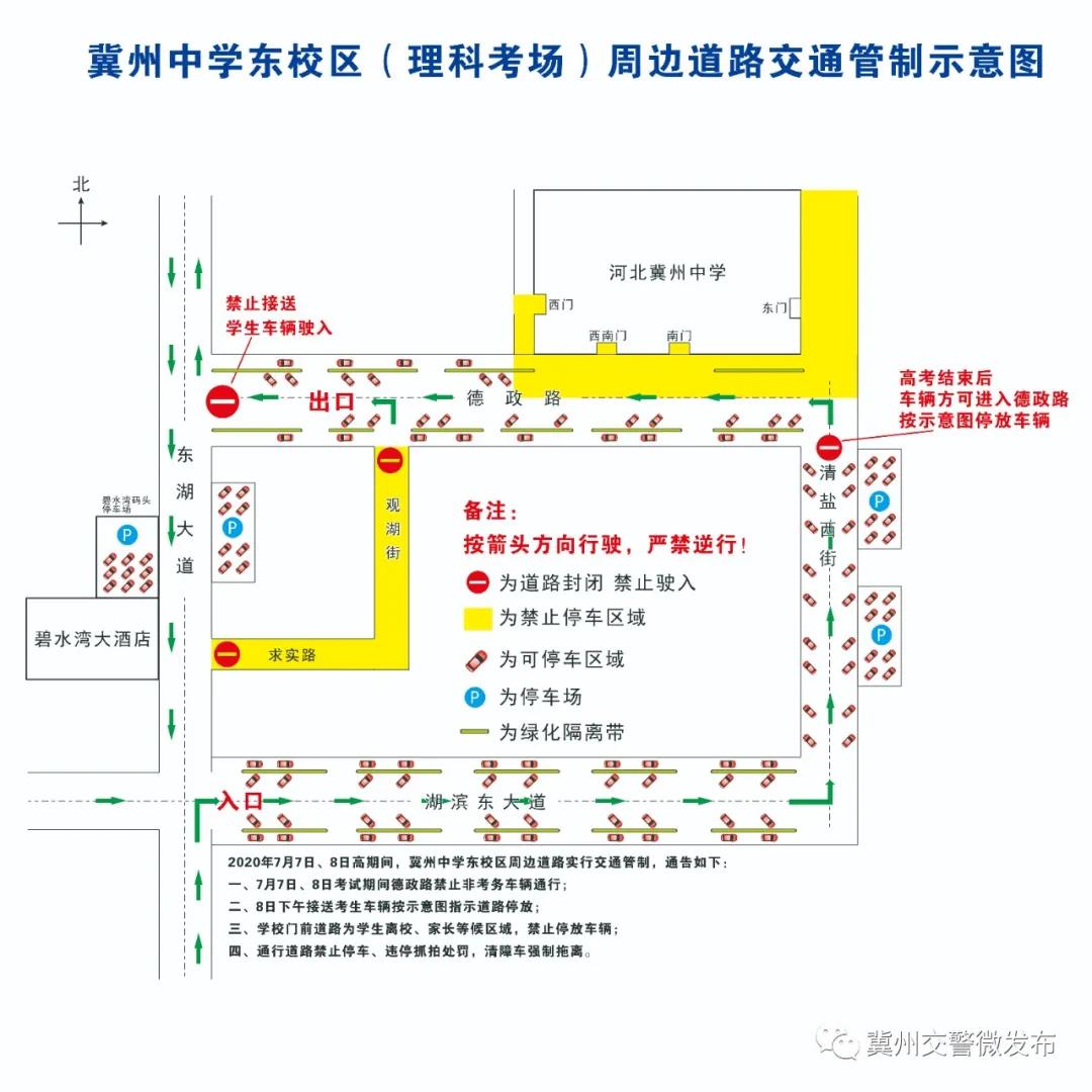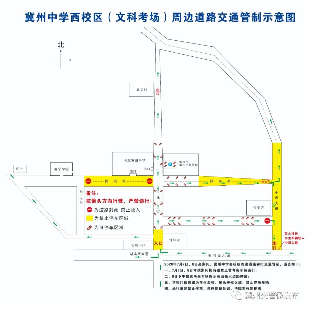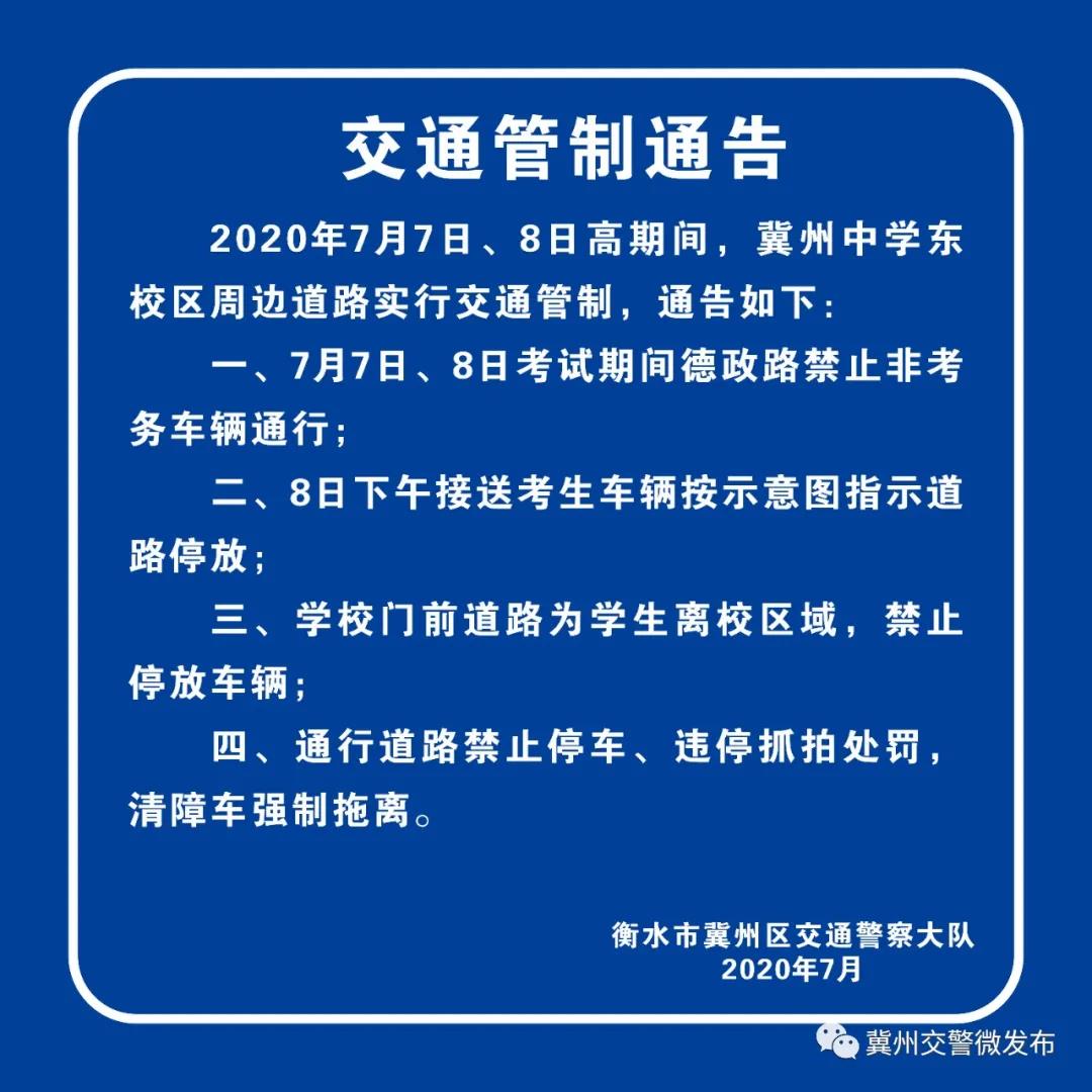 具体的交通管制路段为:衡水中学考点周边,南门口街、英才路路段实施交通管制,禁止无关车辆进入英才路,禁止车辆鸣笛。在衡水二中考点周边,交警部门将对大庆路东段、问津北街、新桥北街实施交通管制,禁止无关车辆进入问津北街,禁止车辆鸣笛;大庆路040省道,禁止一切货车驶入大庆路。需要特别提示的是,7日、8日12:30—14:00以及8日14:45-15:30(高考听力时间),交警将临时对大庆路新桥北街—问津街段实行临时交通管制。志华实验中学考点处,交通管制路段为战备路,禁止一切货车驶入战备,禁止车辆鸣笛。大庆路十四中学考点处,学校门口设有警戒带,反光桶、禁止鸣笛牌,东西两侧各设有二十米禁区。职教中心考点处,将对桃园路康泰街交叉口实行交通管制,禁止无关车辆驶入。顺平中学考点处,将对人民路西外环路段实行交通管制,路口设置提示牌,禁止车辆驶入。阳光中学考点处,将对宁安路前进街、康泰街路段交通管制,禁止无关车辆驶入。桃城中学考点处,将对永兴路庆丰街以北、永兴路前进街路段实行交通管制,禁止无关车辆驶入。同时,交警部门在衡水第一中学考点处,包括横一路西头和纵一路北头、横一路东头三个关键点位均进行了警力部署,禁止无关车辆进入,同时安排了护考警力,并做好后勤保障。在橫一路、纵一路和衡水湖连接线处,交警部门按班次划分了高考车辆停放区域,家长需按所属班次在指定区域停车等待,学校安排接驳车,将学生和行李统一运送到班次区域。