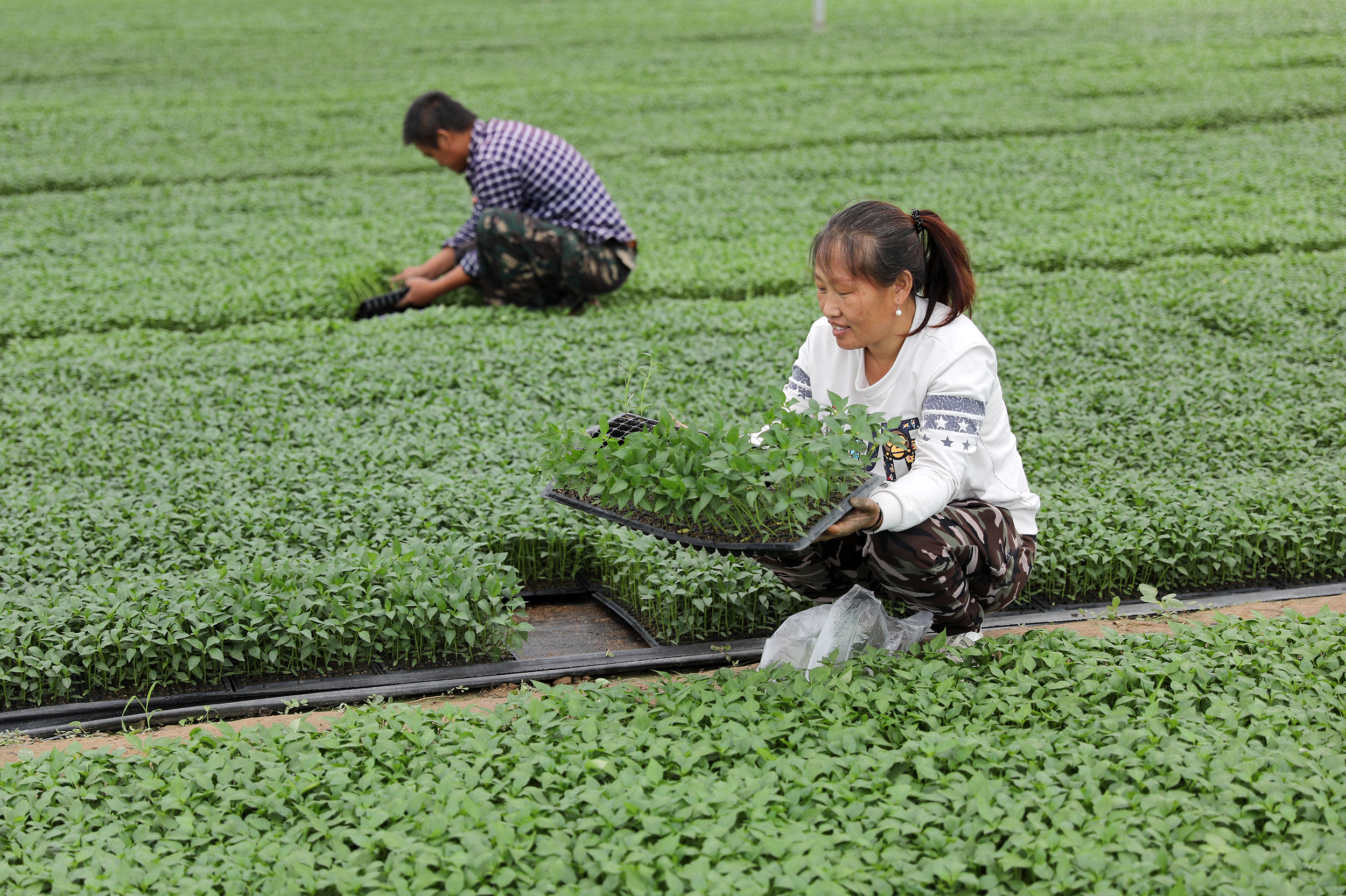 在连栋温室棚内,20多厘米高且十分整齐的辣椒非常吸引眼球。正在浇水的辣椒苗在阳光的照映下熠熠生辉,还有两三个工人正在忙碌着……整个大棚一派生机勃勃。贾三虎介绍,这两座高标准的连栋温室大棚是2018年在中央党校援助下建成的,总占地6亩,目前有辣椒苗450万棵。之前还有白菜苗、嫁接黄瓜苗、嫁接甜瓜苗……通过采取订单式育苗,由合作社与经销商签订育苗需求订单,合作社再根据订单需求组织育苗,有效解决了滞销的难题。