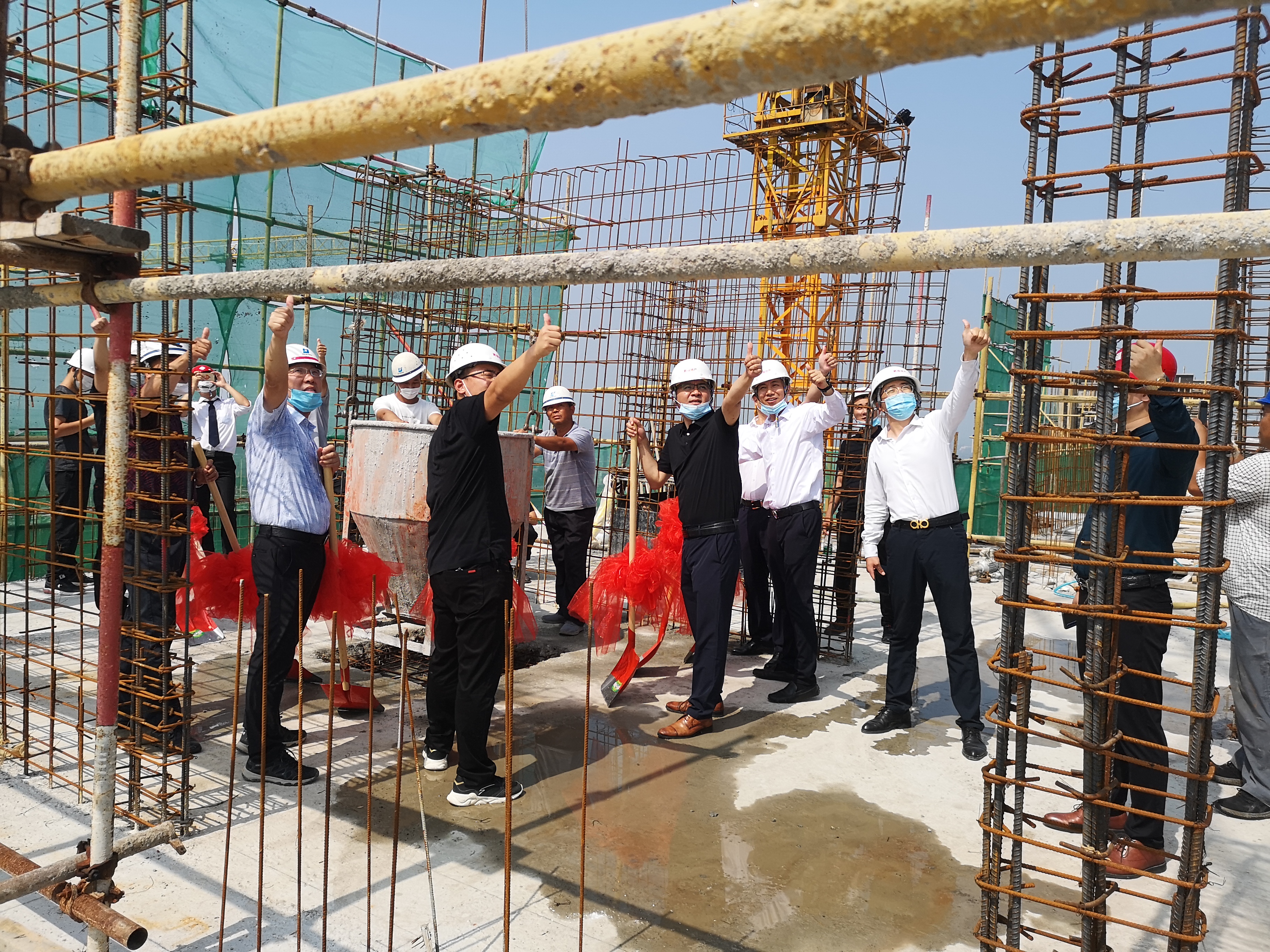 当天上午,滨湖国际项目现场人气爆棚,滨湖国际地产领导、施工单位代表、监理单位,以及业主代表齐聚一堂,只为见证封顶这一振奋人心时刻。9时许,随着最后一铲水泥的成功浇筑,滨湖国际工程B1区37号楼正式封顶,展示了项目铸造精品工程的决心。